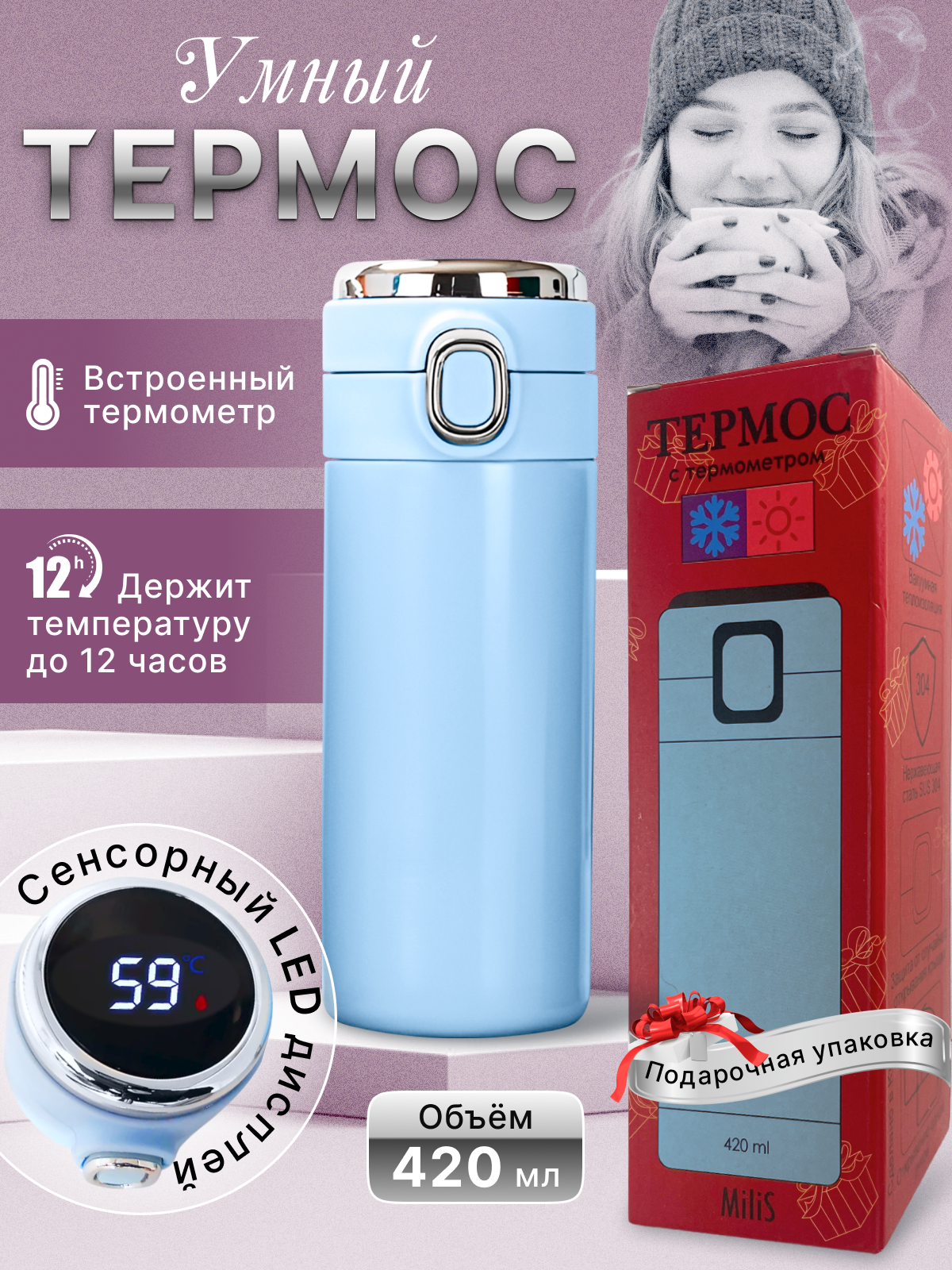 Умный термос с дисплеем, датчиком температуры 420 мл голубой