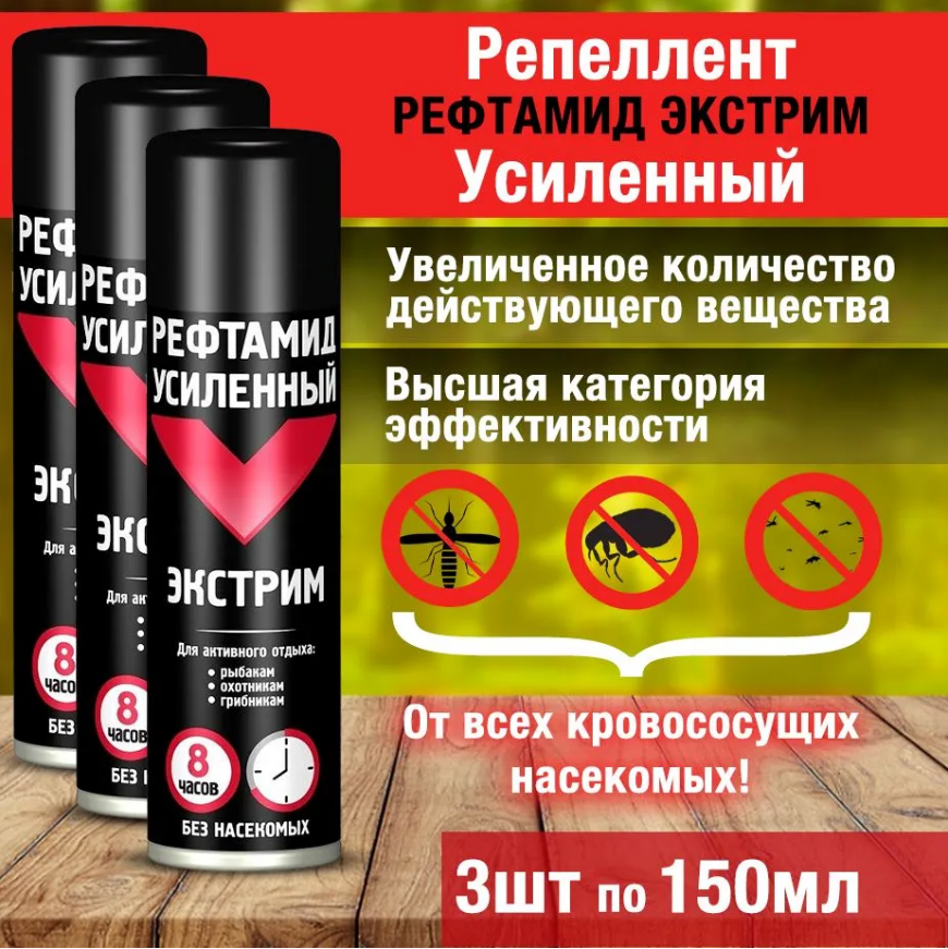 Аэрозоль Рефтамид Усиленный Экстрим 8 в 1 от насекомых, 150 мл. 3 баллона . До 8 часов защита от насекомых