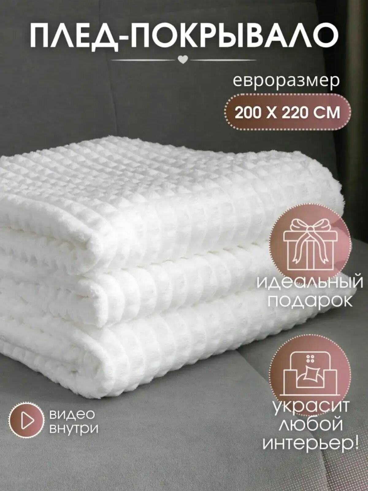 Плед-покрывало кубик Велсофт 200 x 220 см, евро флисовый Белый информация: