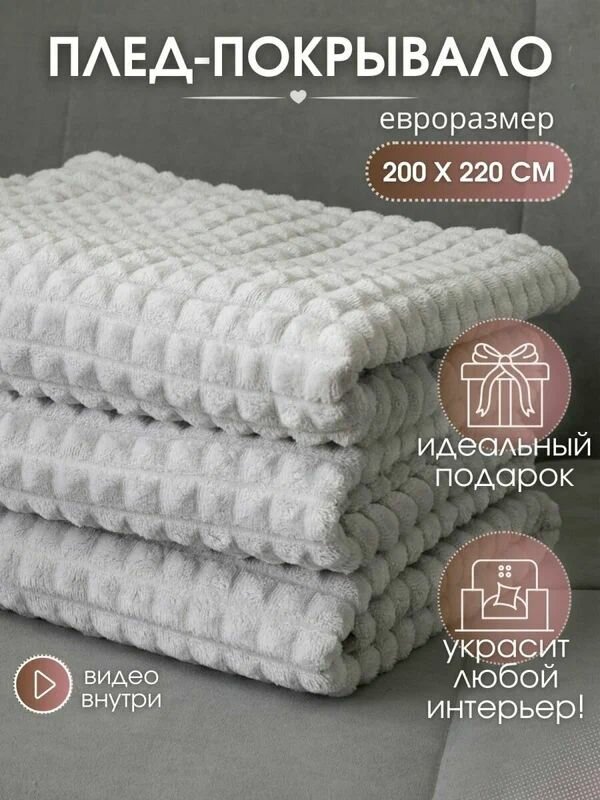 Плед-покрывало кубик Велсофт 200 x 220 см, евро флисовый светло-серый информация: