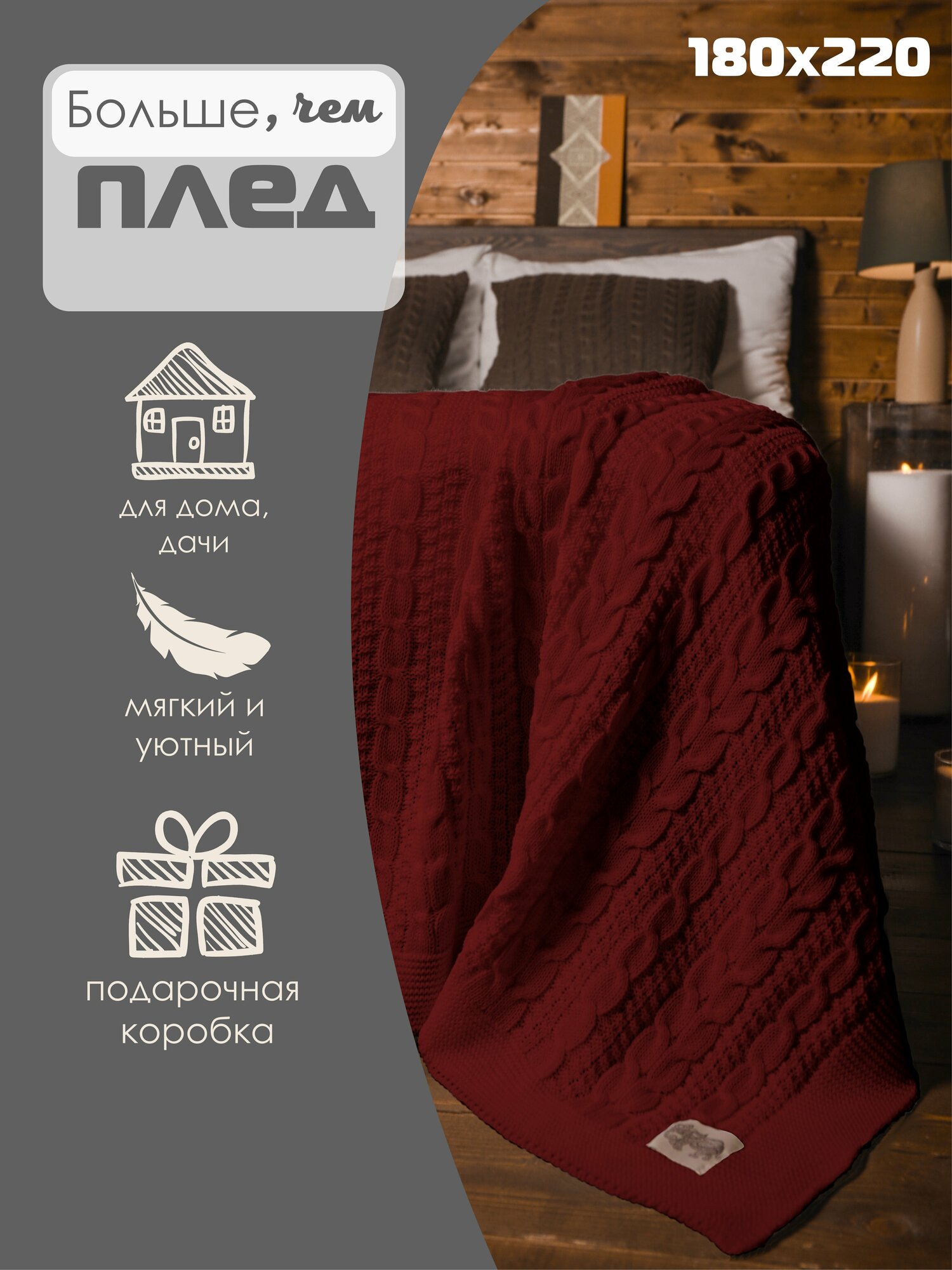Плед 180х220, вязаный, Warm Whiff, бордовый, хлопок, покрывало на кровать, на диван, на кресло, в подарочной коробке информация: