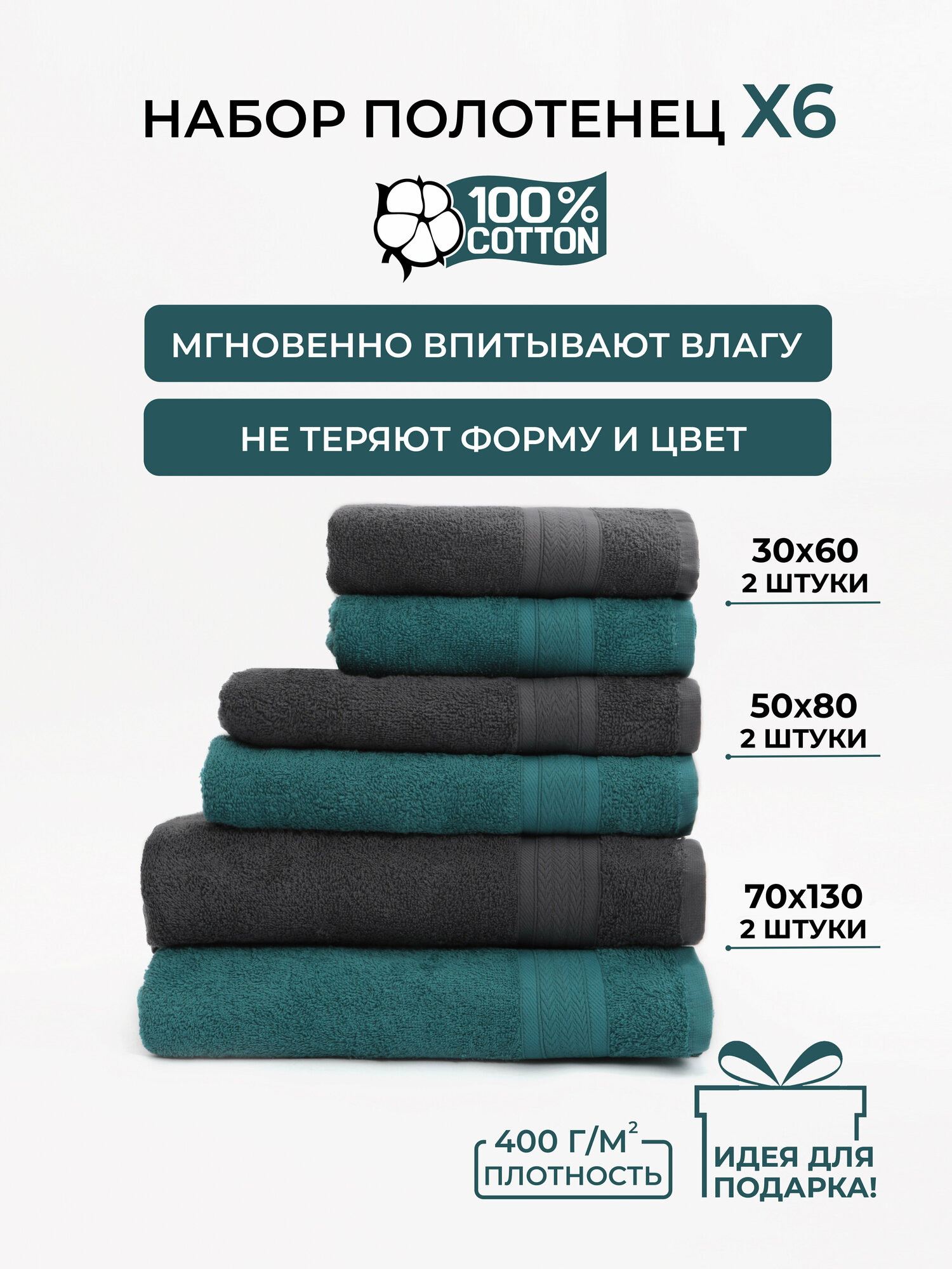 10 цен на Антрацит + морская волна набор № 1301 махровых полотенец 6 шт (30*60 2 шт, 50х80 2 шт, 70*130 2 шт)