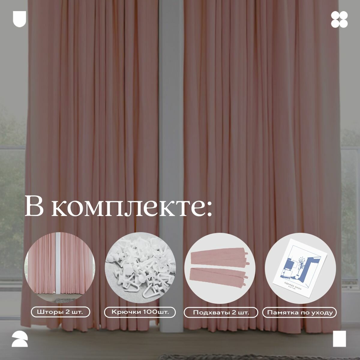 | Комплектация | Шторы -2 шт., комплект крюков, памятка по уходу - 1 шт. |