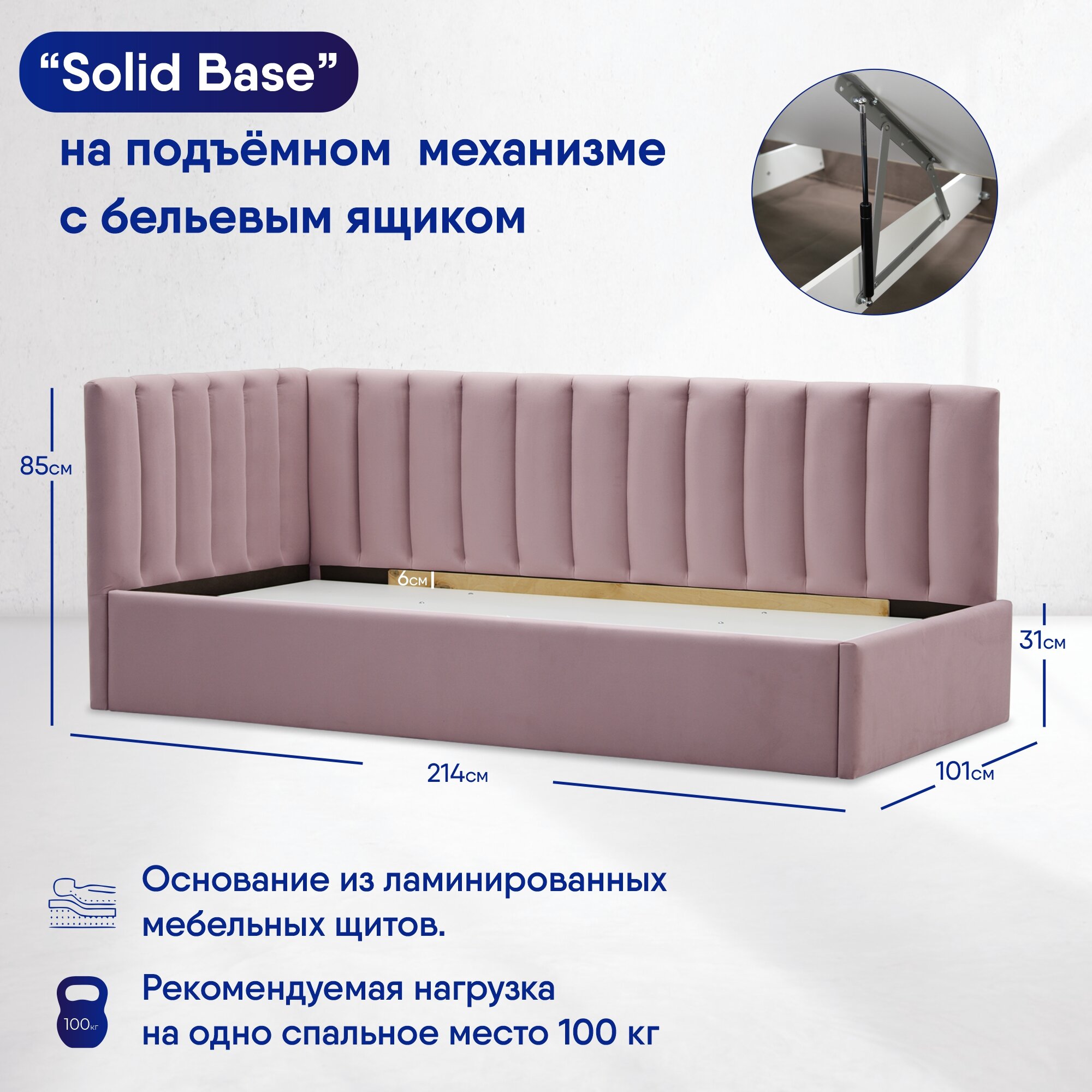 | Особенности | мягкое изголовье, основание под матрас, с подъемным механизмом, с ящиком для белья |