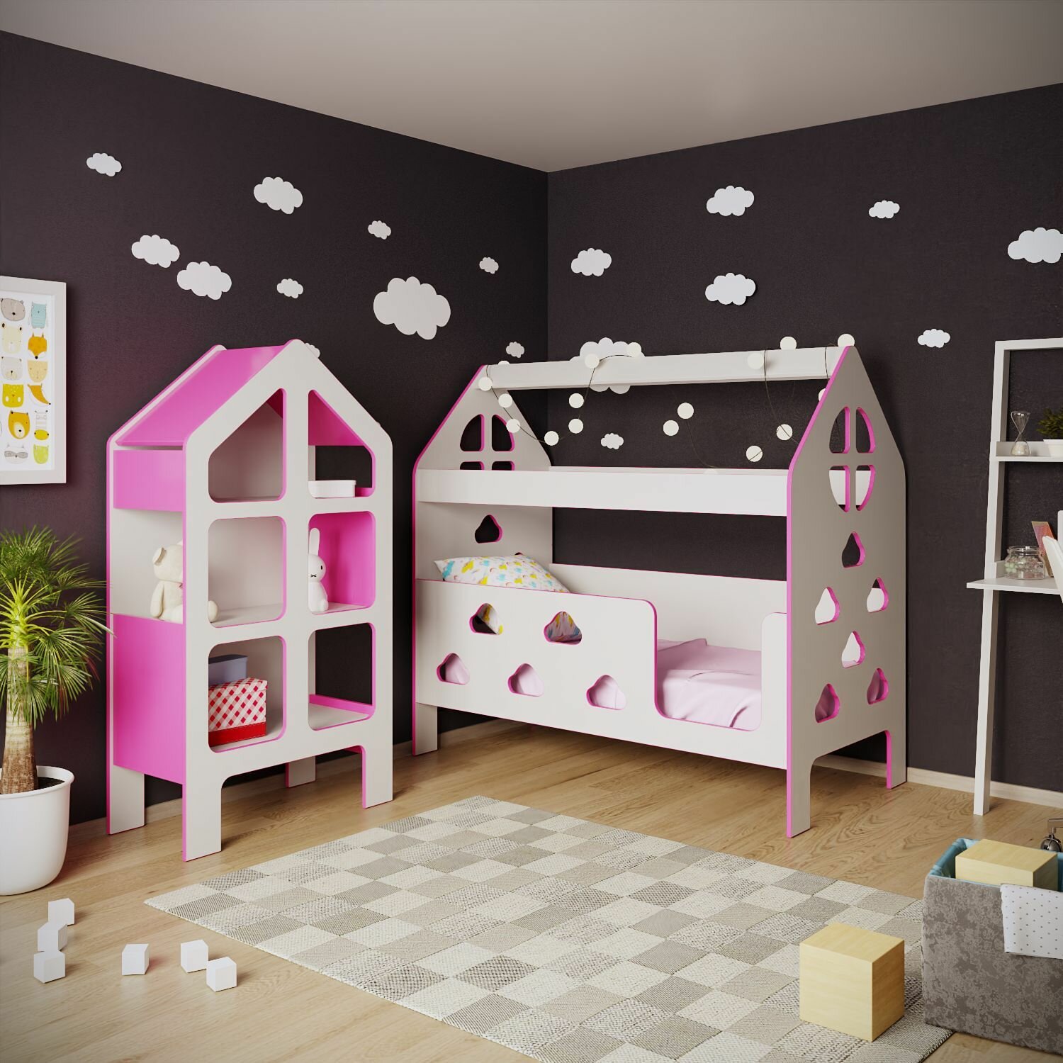 Кровать детская с бортиком под матрас 160х80, кровать-домик "Облачка", БазисВуд, вход справа, цвет розовый информация: