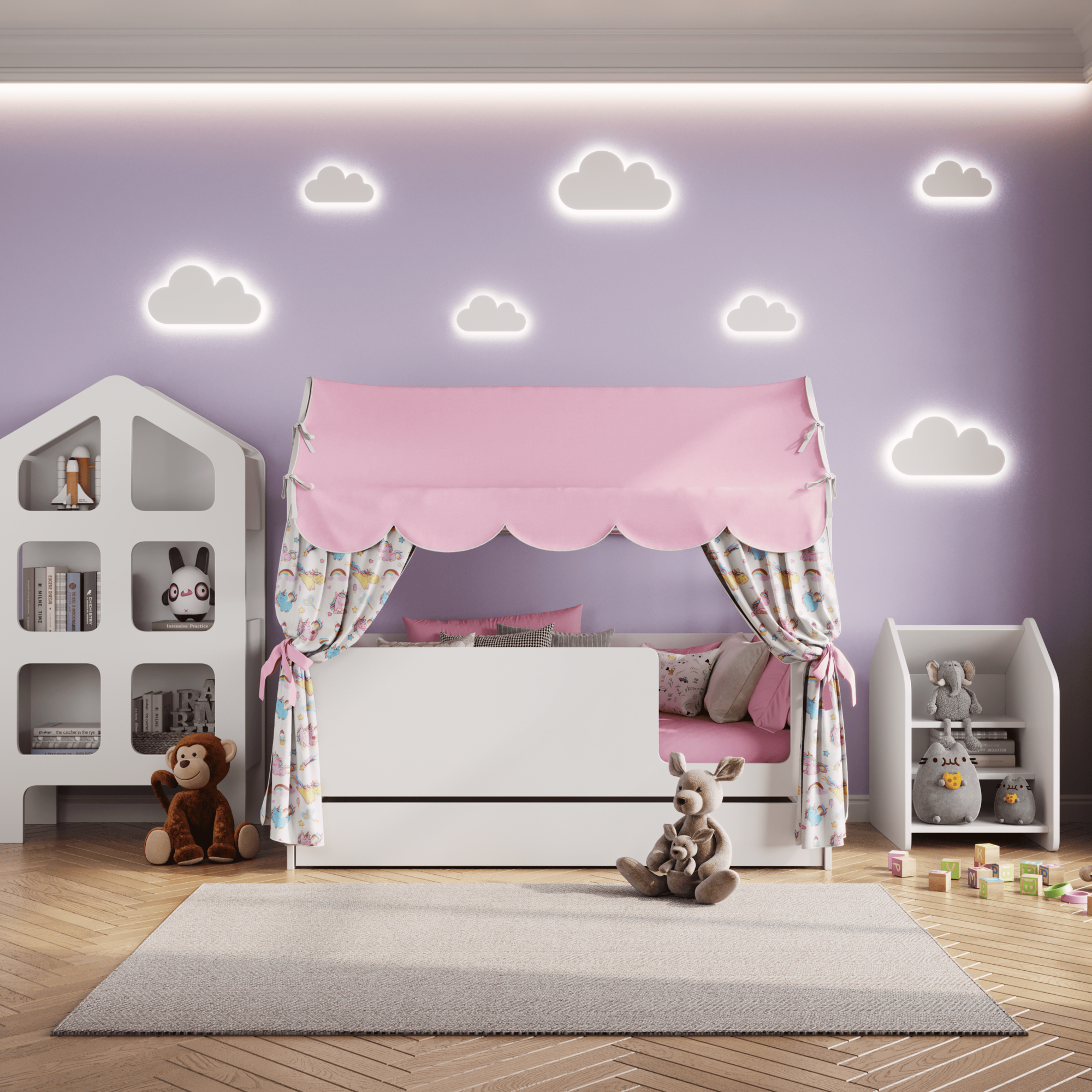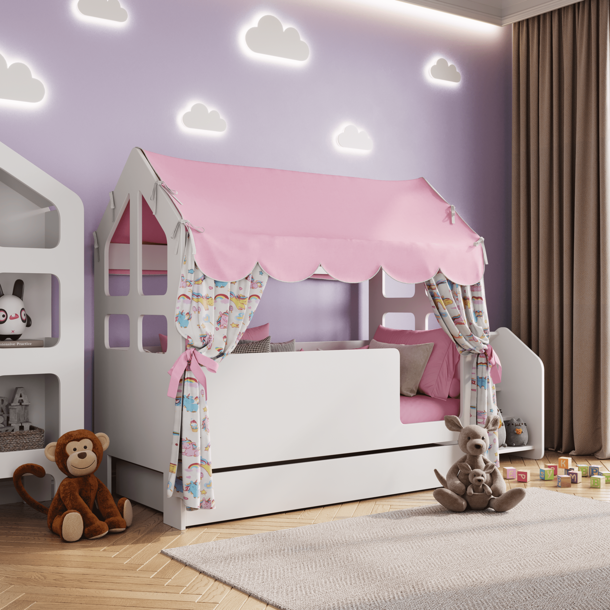 Кровать-домик, Кровать детская с бортиком под матрас 160х80, БазисВуд "Сладкий сон" с текстилем (розовый с единорогами) и ящиком, вход справа информация: