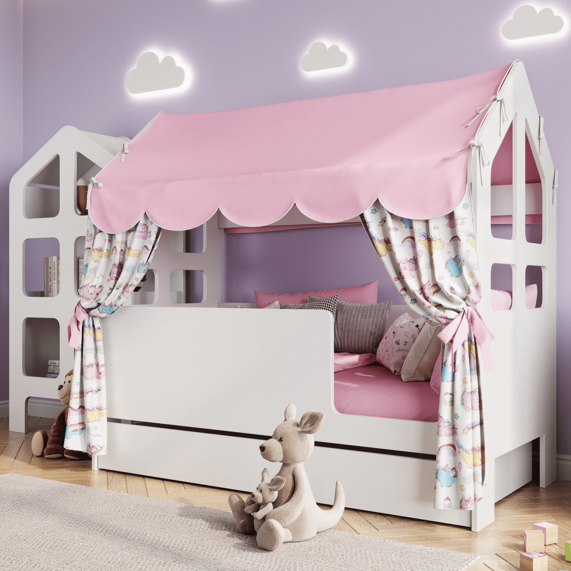 10 цен на Кровать-домик, Кровать детская с бортиком под матрас 160х80, БазисВуд "Сладкий сон" с текстилем (розовый с единорогами) и ящиком, вход справа