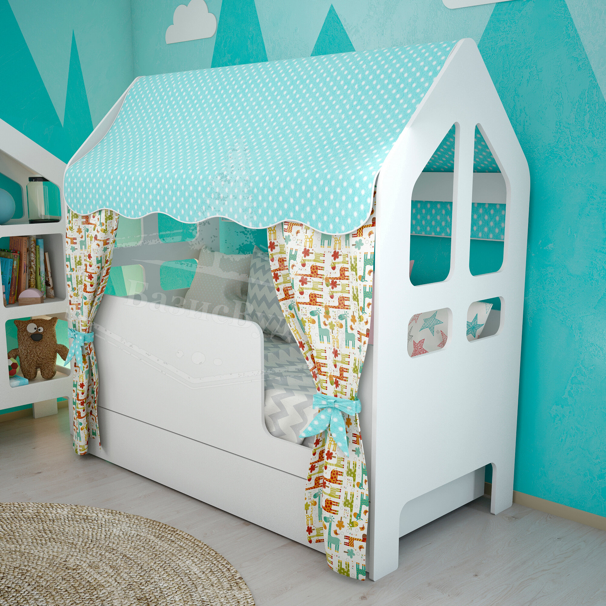10 цен на Кровать-домик, Кровать детская с бортиком под матрас 160х80, БазисВуд "Сладкий сон" с текстилем (бирюзовый, с жирафиками) и ящиком, вход справа
