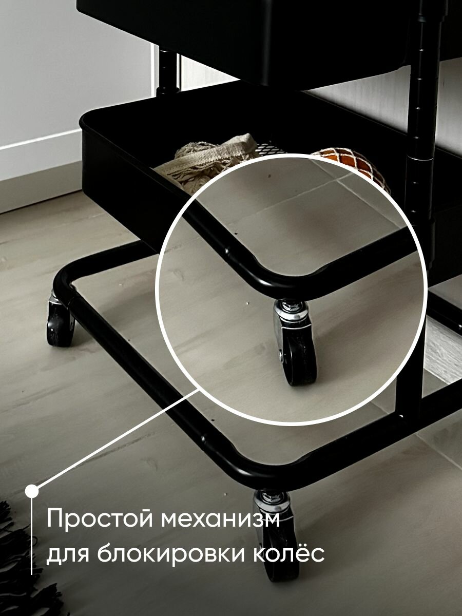 Этажерка металлическая 3-х ярусная на колёсиках с регулируемой высотой полок (аналог икеа), для кухни, ванной / черная информация:
