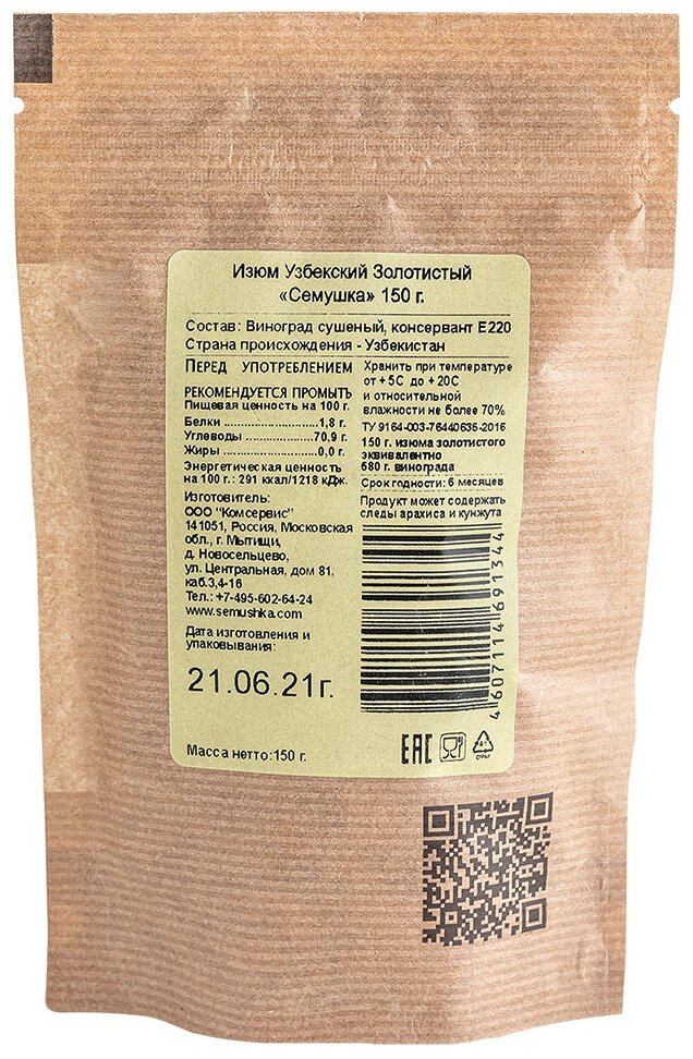 Изюм Семушка узбекский золотистый, 150 г информация: