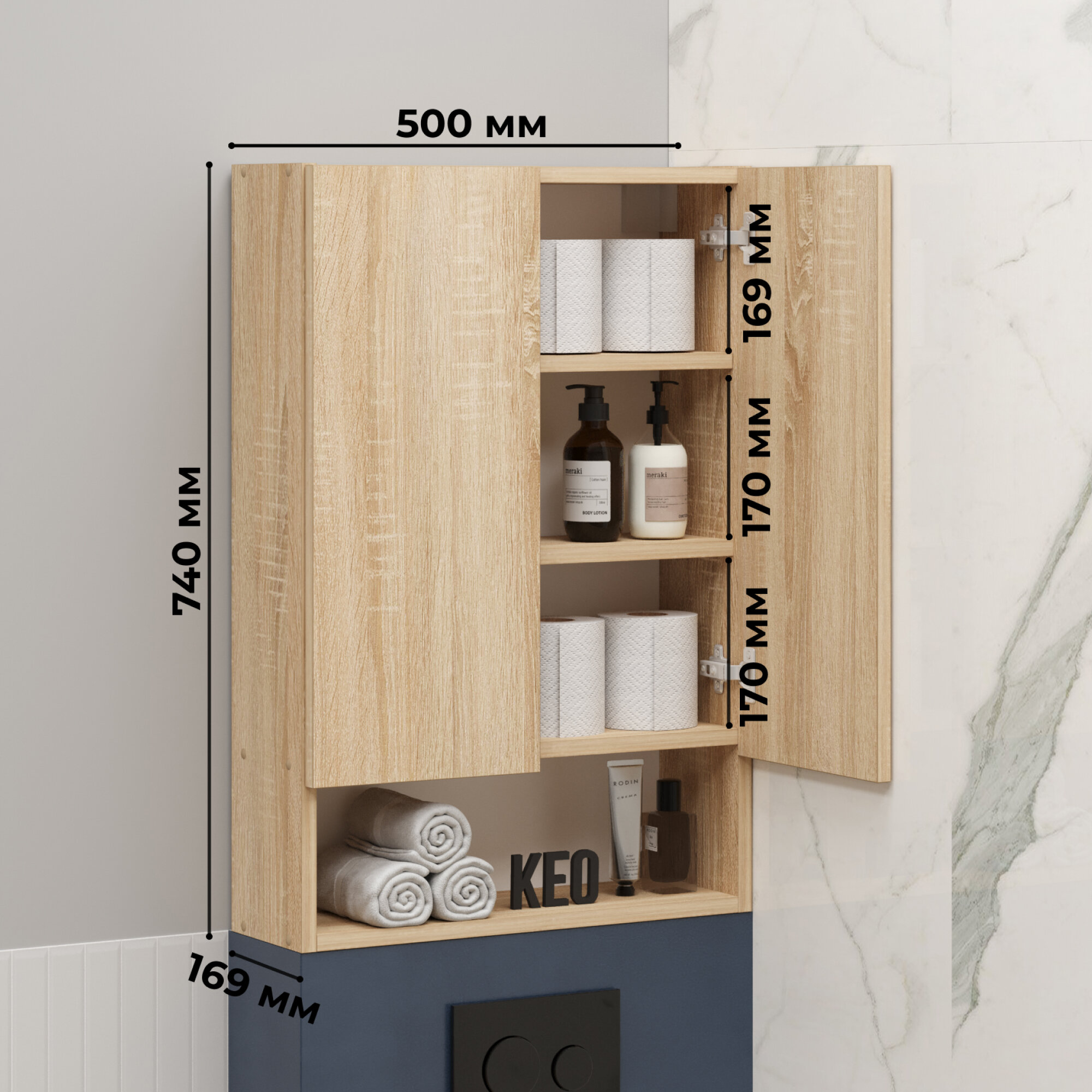 Шкаф навесной с полками для ванной прихожей балкона подвесной Кео ШКН-130 бежевый Дуб Сонома 740х169х500 мм информация: