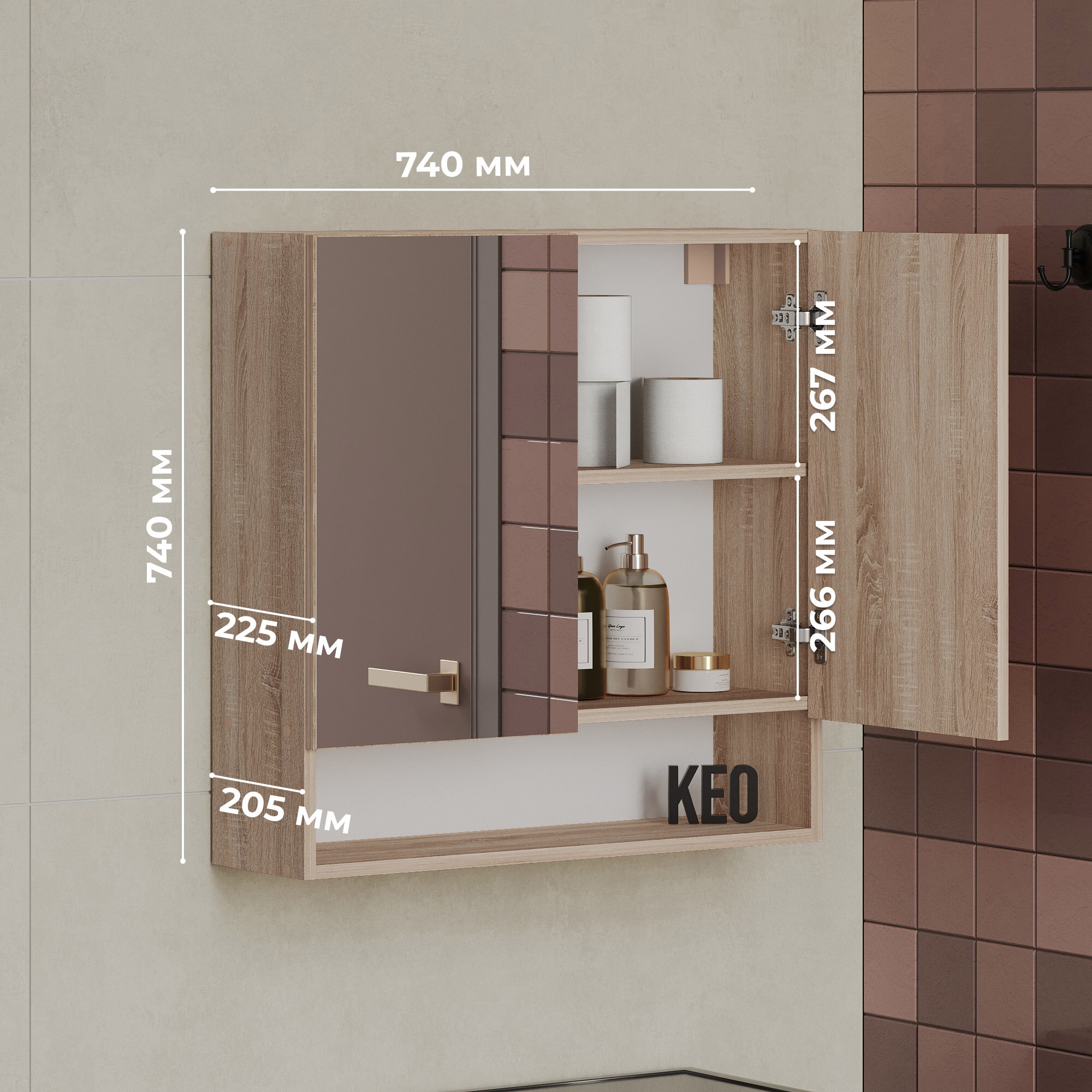 Шкаф навесной распашной Кео ШКН-230 дуб сонома с зеркалами полками для вещей в ванную прихожую 740х225х740 мм информация: