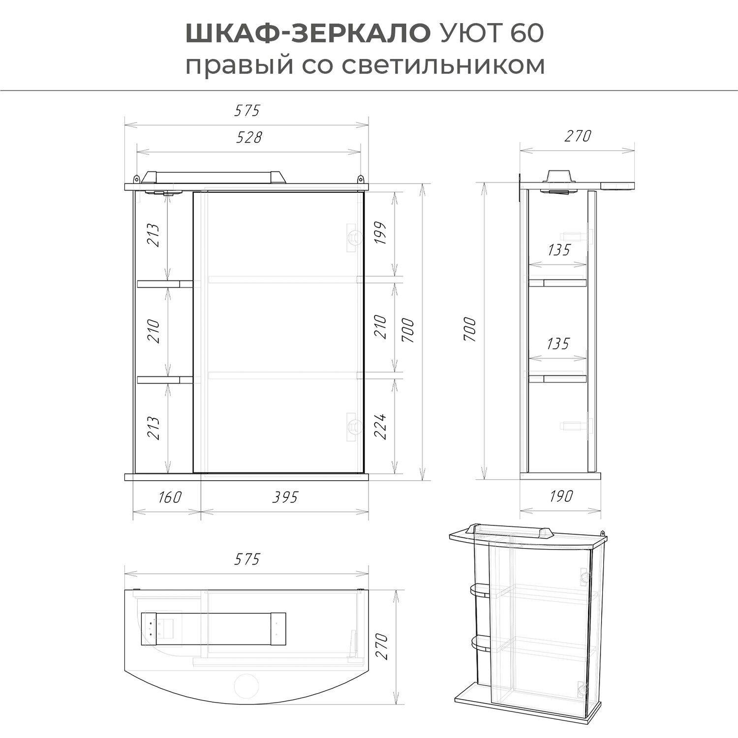 Шкаф зеркало IKA Уют 60 575х270х700 правый со светильником информация: