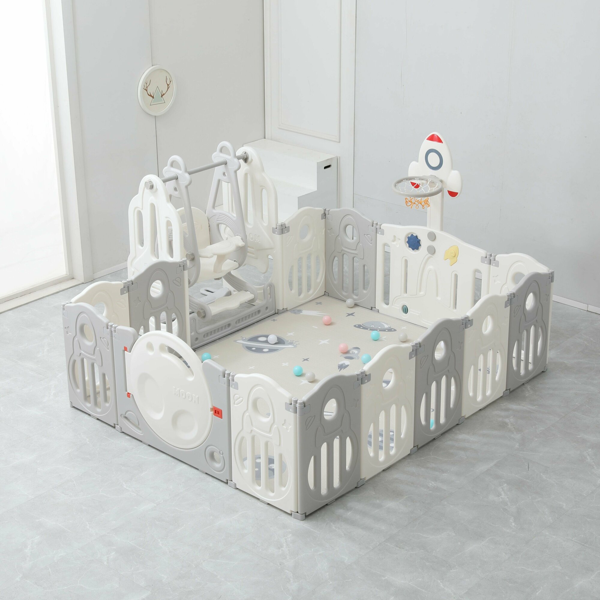 10 цен на Манеж UNIX Kids "SUPREME Space" Grey серый, 200x200 см, с качелями, ковриком, горкой, баскетбольным кольцом, для дома, улицы