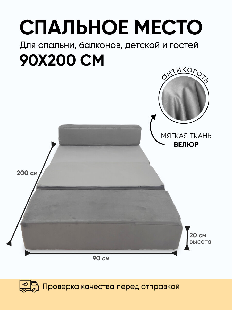 Бескаркасное кресло-кровать Relaxline Кубо, 90х80х60, велюровое, серый, спальное место 200х90 информация: