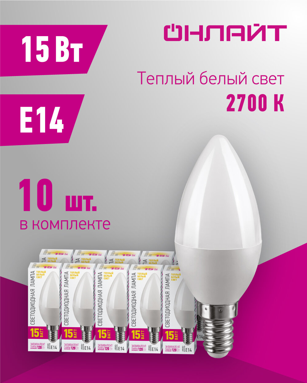 10 цен на Лампа светодиодная онлайт 90 440, 15 Вт, свеча Е14, теплый свет 2700К, упаковка 10 шт.