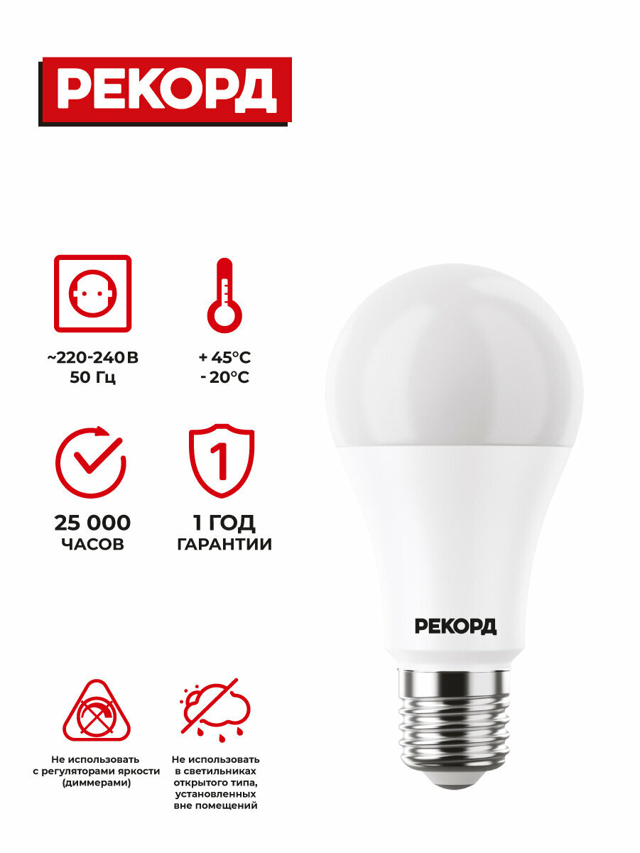 Набор светодиодных лампочек рекорд LED A60 14Вт E27 4000К для дома, для гостиной комнаты, 5 шт. информация: