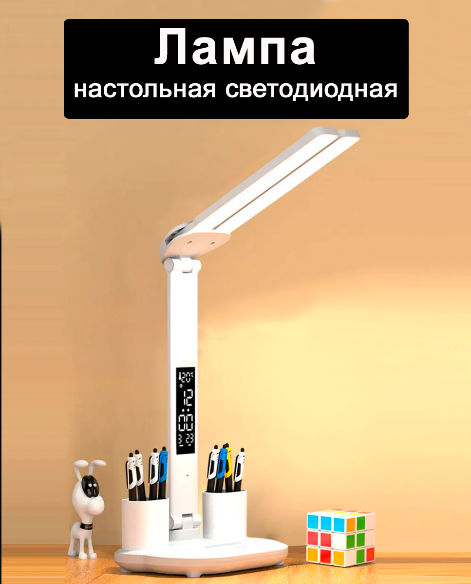 Настольная лампа светодиодная многофункциональная LED с будильником календарем беспроводной зарядкой часов