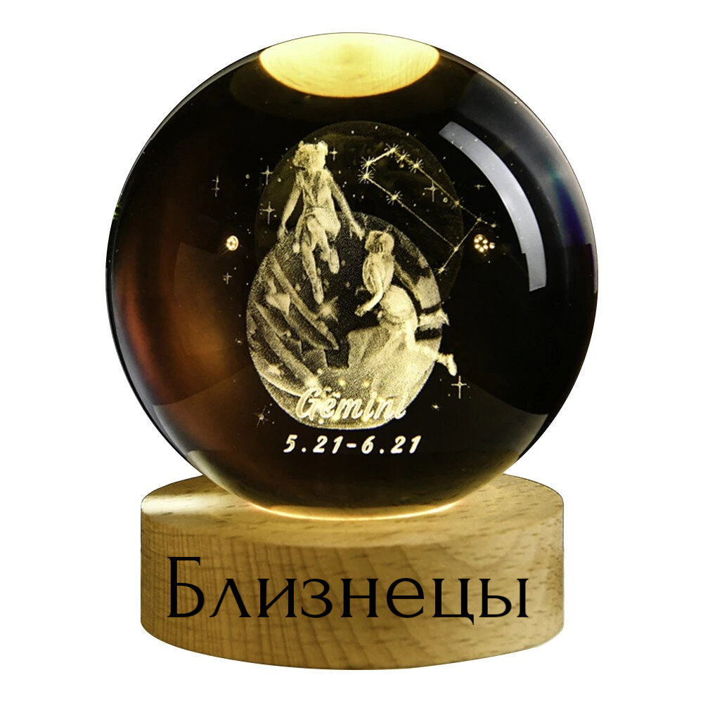 Хрустальный шар ночник Знак зодиака "Близнецы" с 3D лазерной гравировкой информация: