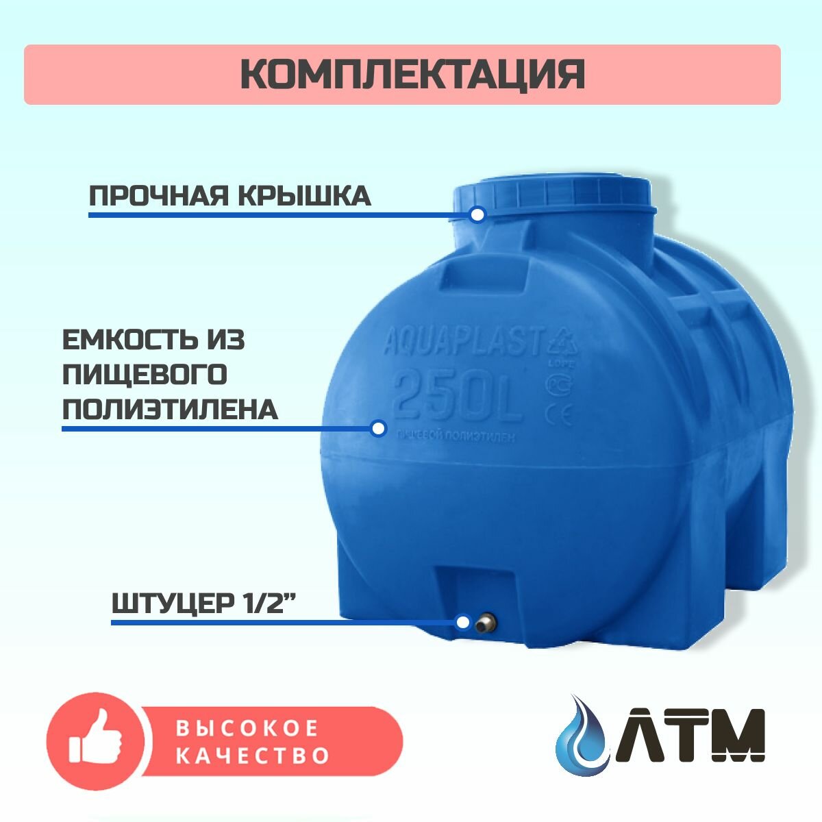 | Комплектация | Емкость на 250 л, крышка, штуцер |