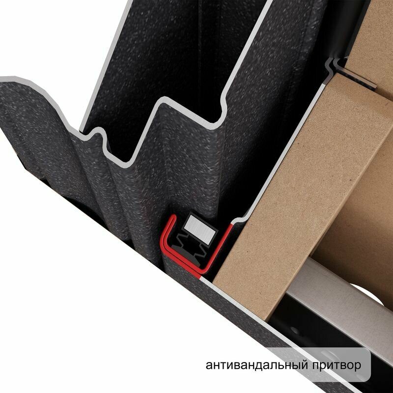 | Дополнительная информация | Замок основной цилиндрический, 4-го класса защиты. Замок дополнительный сувальдный, 2-го класса защиты. Ночная задвижка. Противосъемные ригели с петлевой стороны полотна - 2 шт. Металлический эксцентрик для регулировки притвора входной двери. Петли с опорным подшипником – 2 шт. Комплект фурнитуры. |