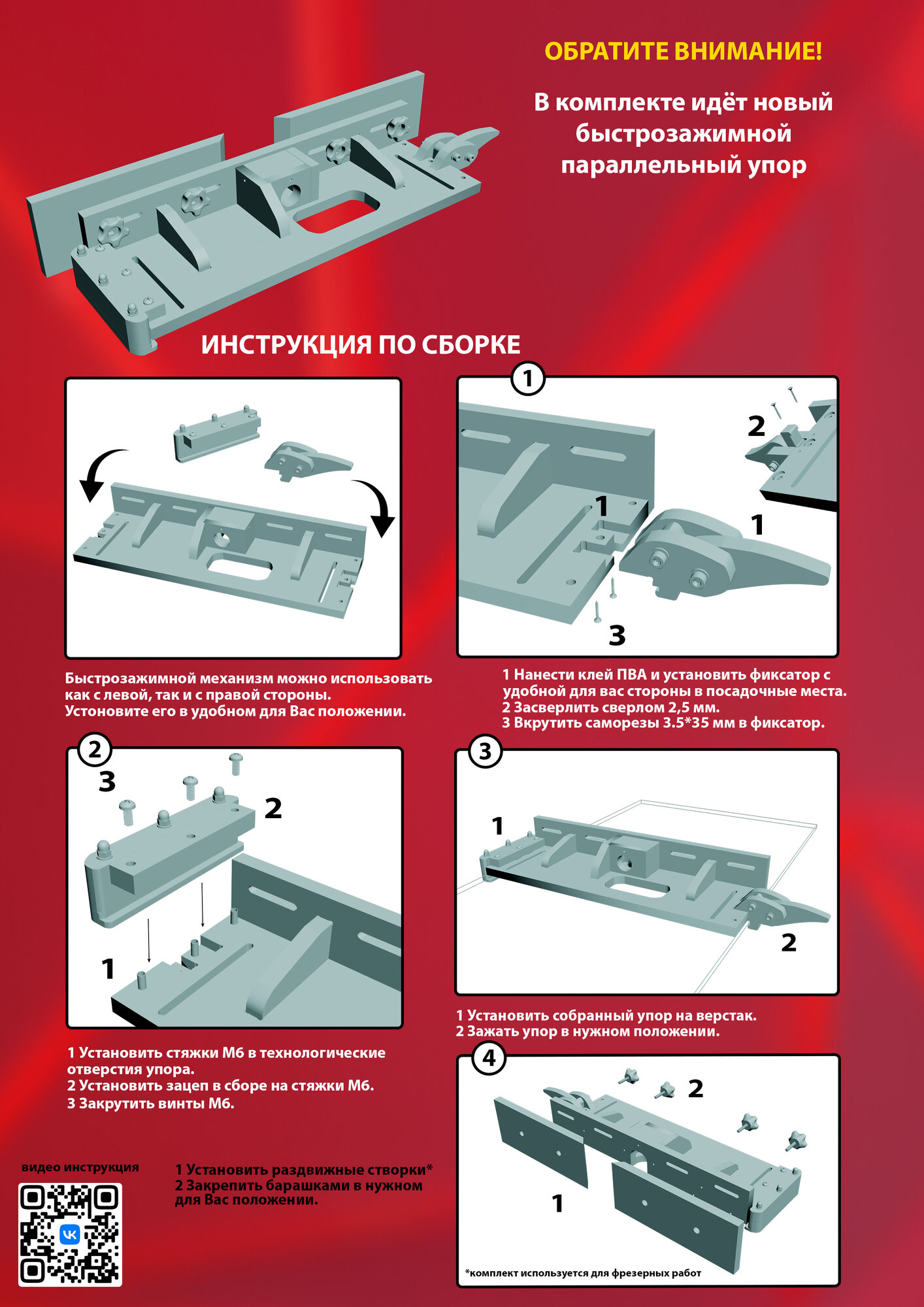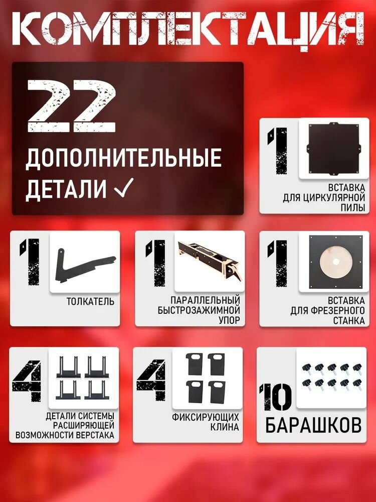 | Подробная комплектация | Верстак, вставка универсальная без пропила, вставка для фрезера, параллельный быстрозажимной упор, система расширяющая возможности верстака (состоит из 4 элементов), барашки 6 штук |