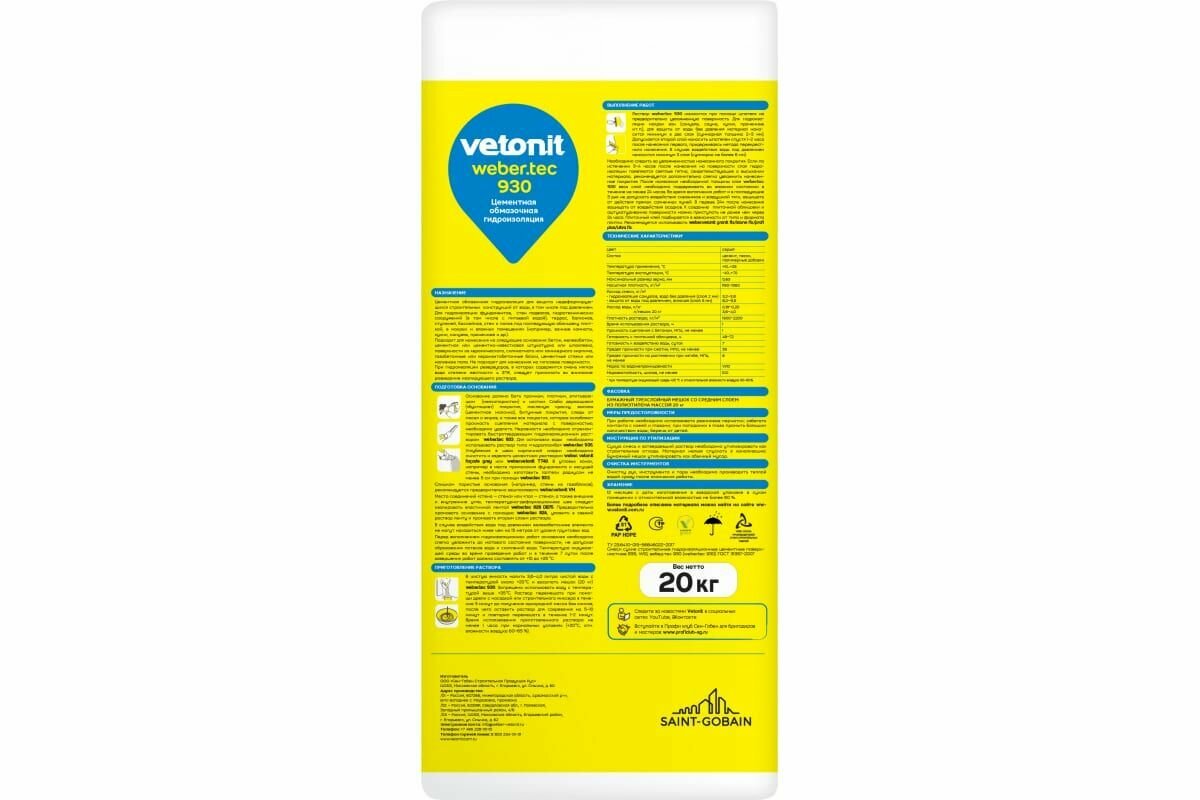 Гидроизоляция цементная Weber Vetonit Weber.tec 930 20 кг / Вебер Ветонит информация: