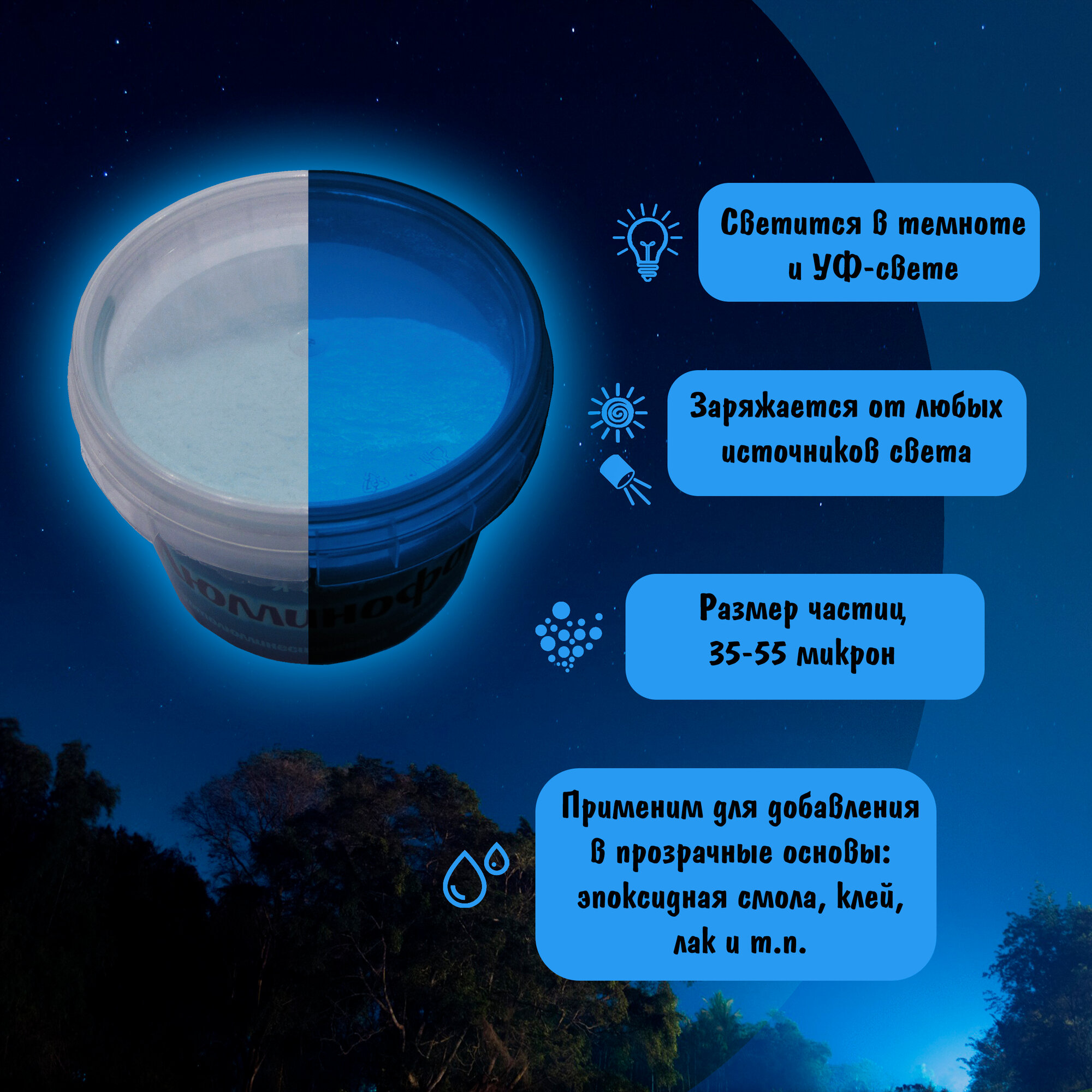 Отзывы на Люминофор (Фотолюминесцентный пигмент), цвет Синий, свечение Синее100 гр.