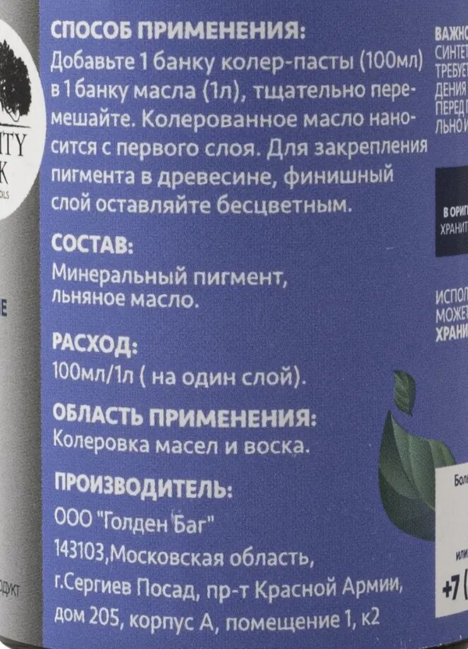 | Дополнительная информация | способ применения: добавьте и смешайте колер - пасты с желаемым составом, в соответствии с рекомендованным количеством для создания необходимого цвета. Возможно получение любых желаемых оттенков. Рекомендуется использовать максимум 40% пигментной пасты от общего веса, в ином случае время сушки масла может существенно увеличиться |