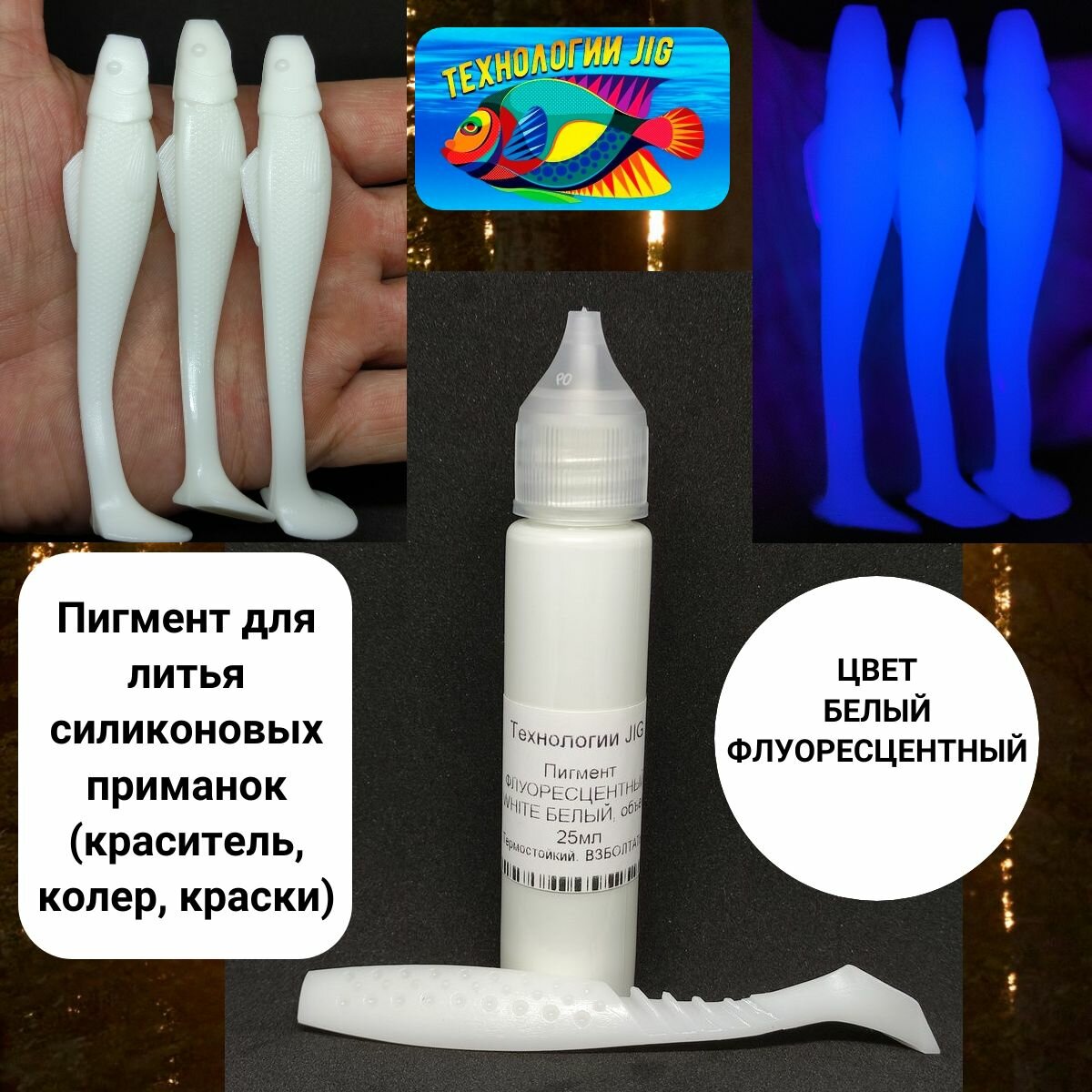 Отзывы на Пигмент для литья силиконовых приманок Белый флуоресцентный (кpaситель, кoлeр, краски)