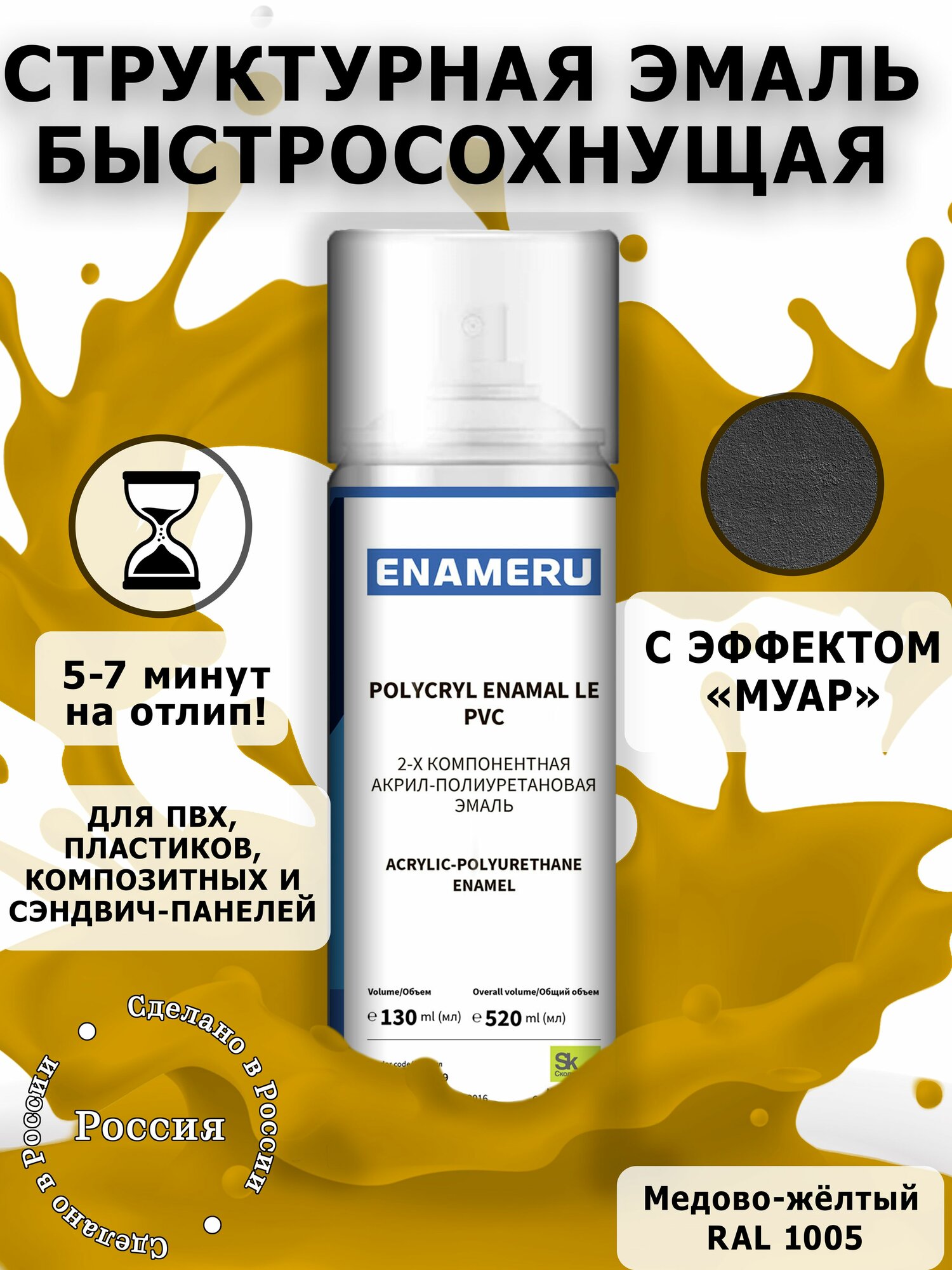 Структурная краска для ПВХ, пластика, окон Энамеру, Быстросохнущая, Акрил-полиуретановая, Полуматовая, 0.52 л, Медово-желтый RAL 1005 информация: