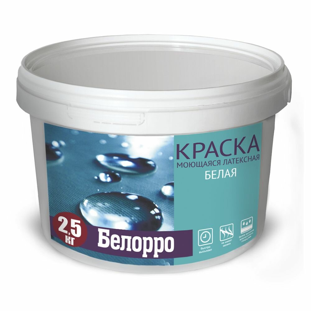 Краска моющаяся латексная Белорро глубокоматовая, белая, 2,5кг информация: