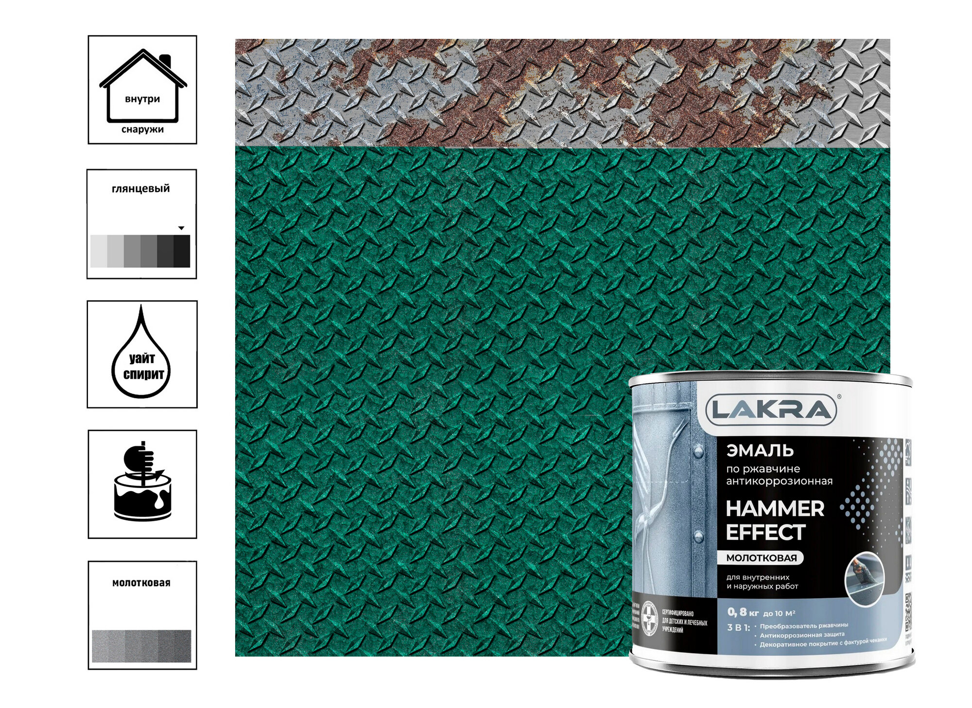 Эмаль по ржавчине Лакра с молотковым эффектом зеленая 0,8 кг информация: