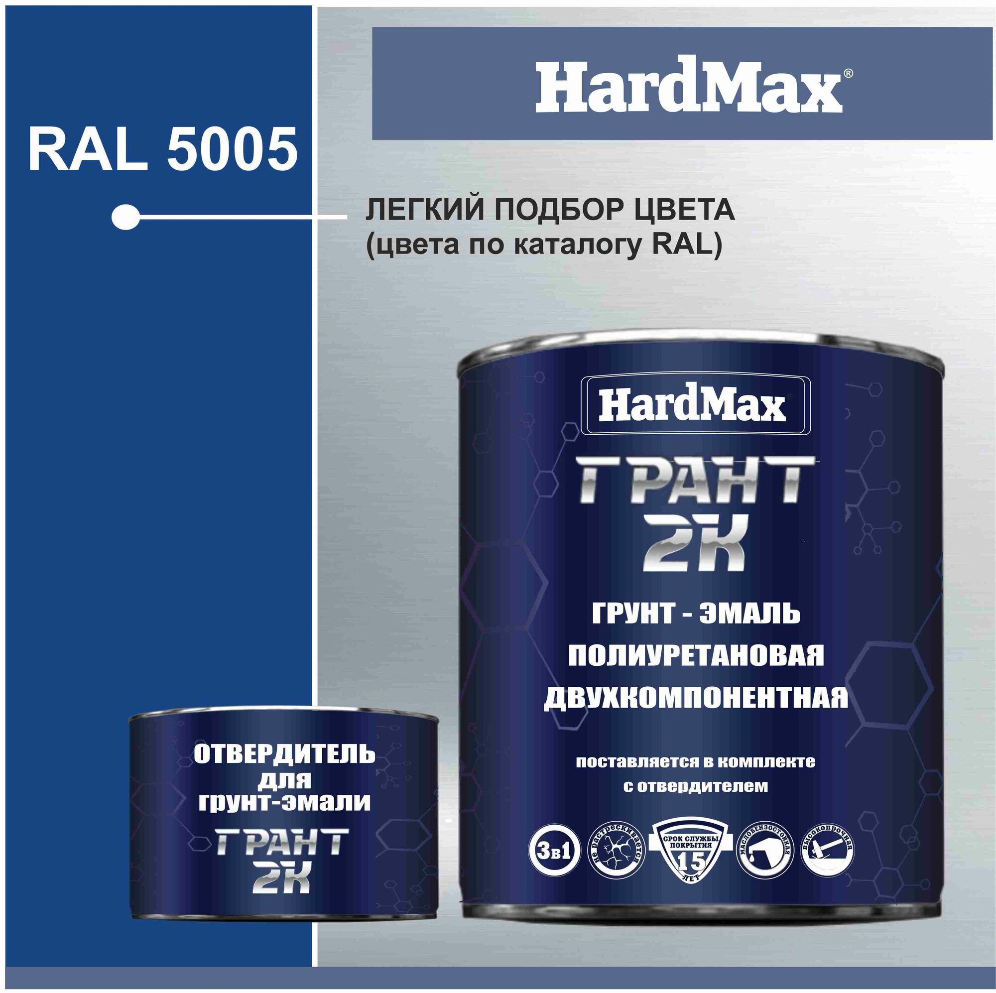 HardMax Грунт-эмаль Грант, краска 2-х компонентная полиуретановая / Быстросохнущая, Гладкая, Полуглянцевое покрытие, 2 л, 2.19 кг, RAL 5005 Сигнальный синий информация: