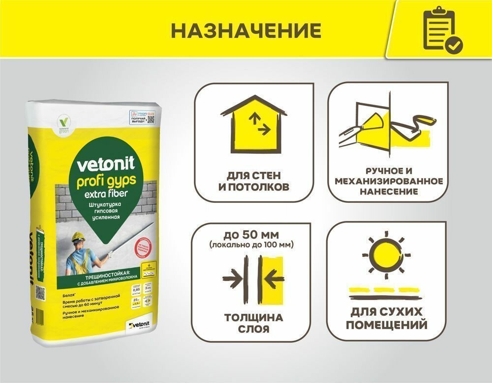 Ветонит Профи Гипс штукатурка гипсовая белая (25кг) / VETONIT Profi Gyps штукатурка гипсовая усиленная белая (25кг) информация:
