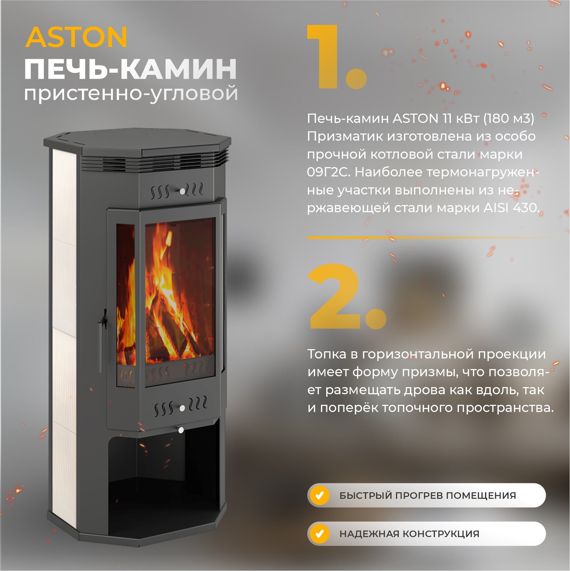 Печь-Камин ASTON 11кВт (180 м3) пристенно-угловой Ø 150мм информация: