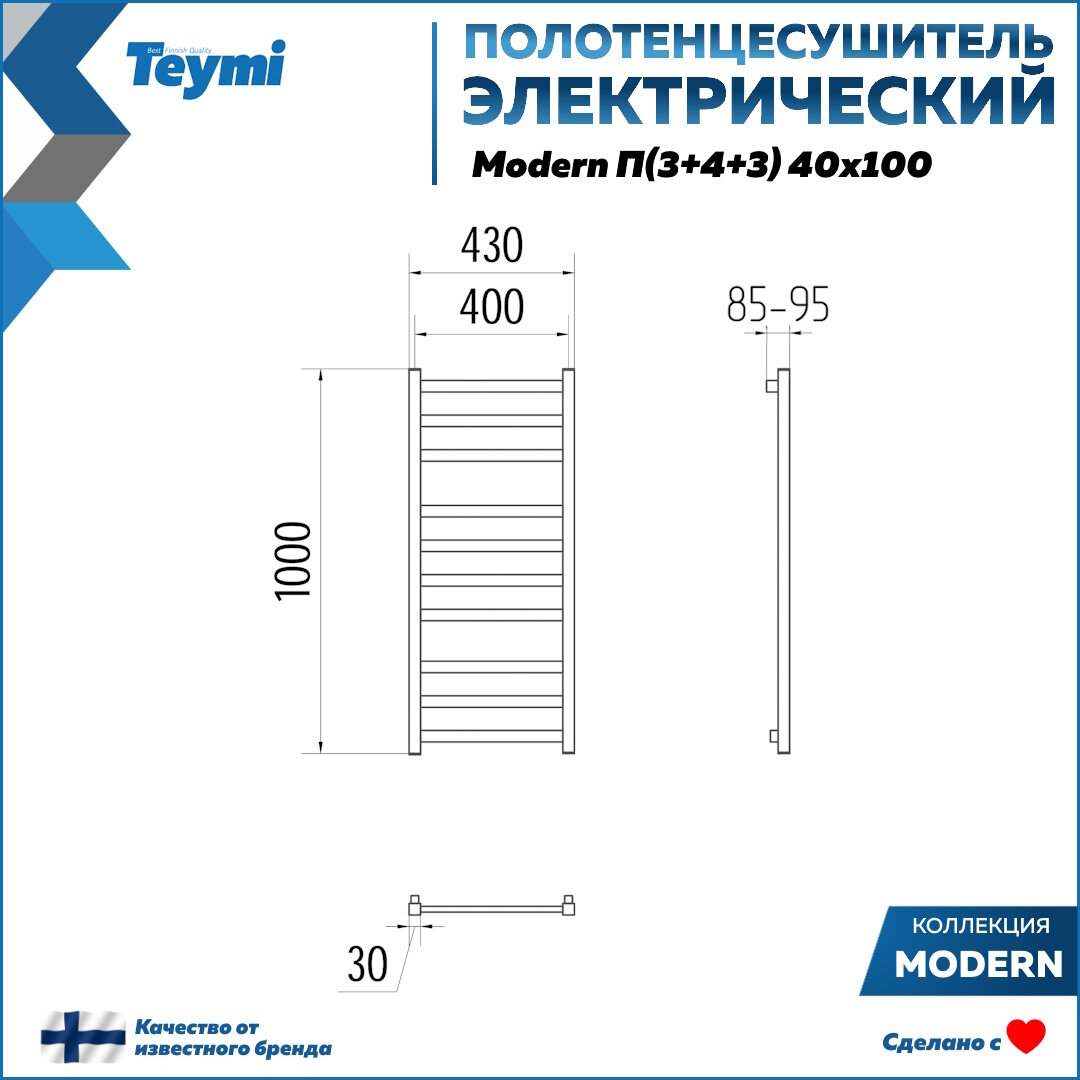 Полотенцесушитель электрический Teymi Modern П(3+4+3) 40х100, квадратный профиль, с таймером, черный матовый E90106 информация: