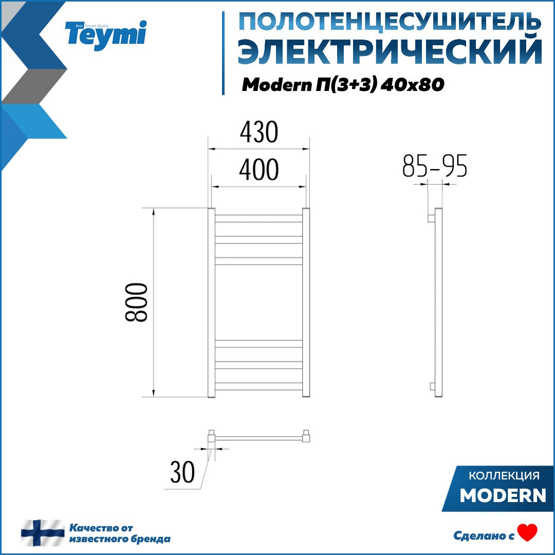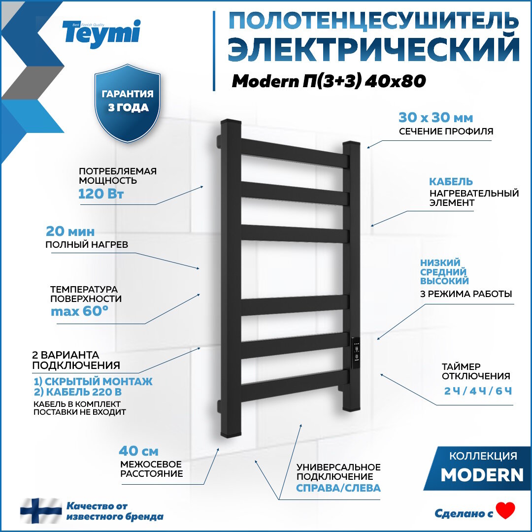 Полотенцесушитель электрический Teymi Modern П(3+3) 40х80, квадратный профиль, с таймером, черный матовый E90102 информация: