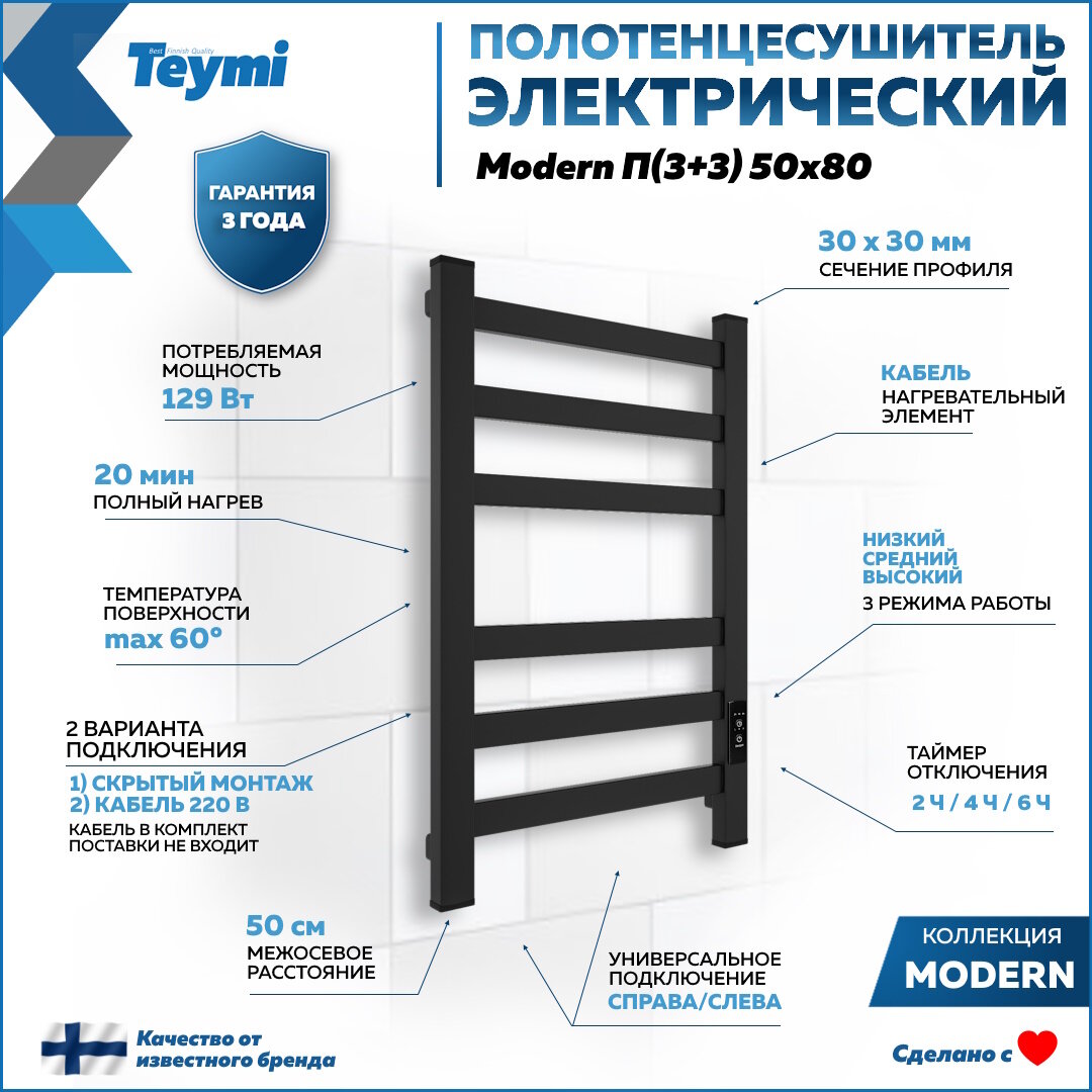 Полотенцесушитель электрический Teymi Modern П(3+3) 50х80, квадратный профиль, с таймером, черный матовый E90101 информация: