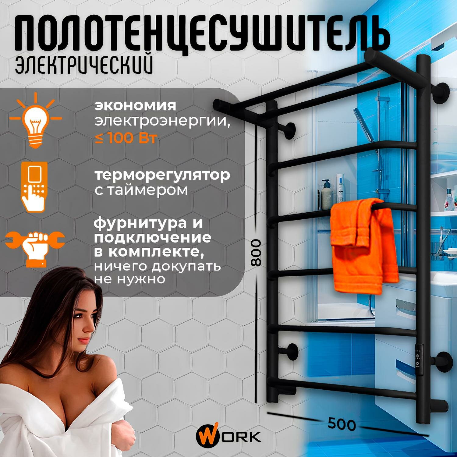 Полотенцесушитель электрический WORK-Оливер 80x50 белый с терморегулятором, 5 перекладин + полка