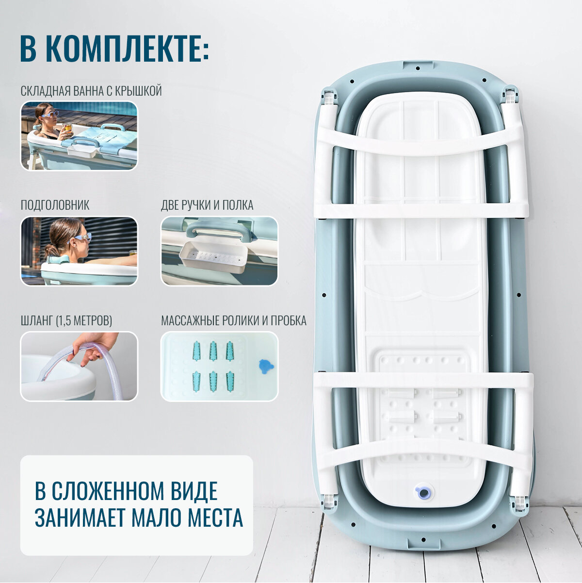 | Подробная комплектация | Складная ванна, мягкий подголовник, две боковые ручки, встроенные массажные ролики для ног, полочка для аксессуаров, дренажная пробка, сливной шланг |