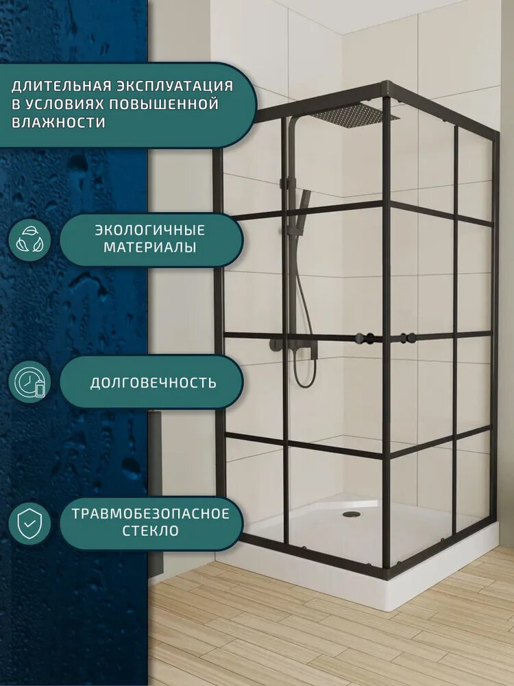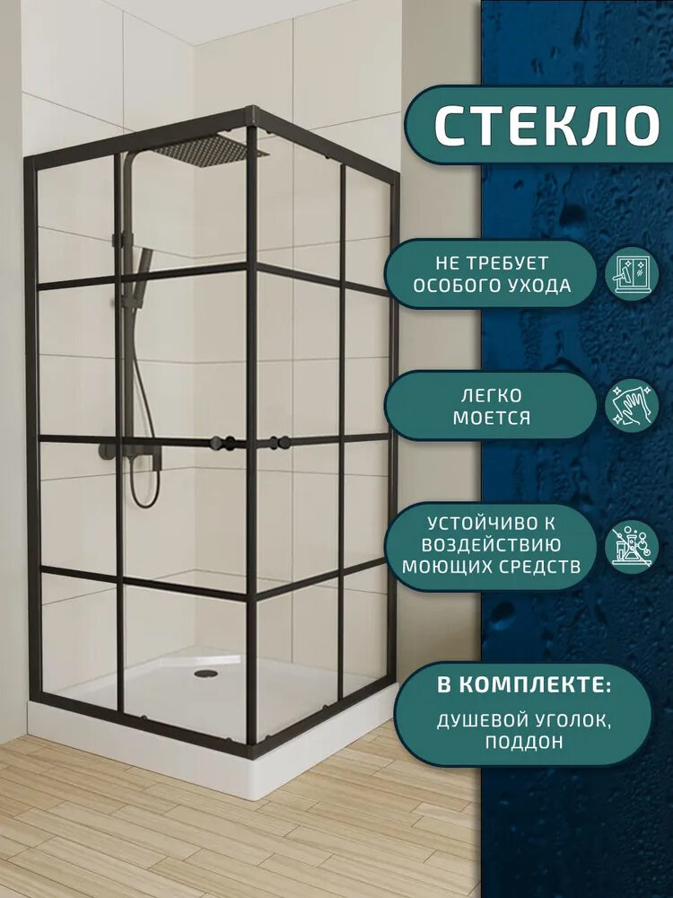 10 цен на Душевой уголок квадратный BAU Stil square 90х90х195, с поддоном 12,5 см, закаленное стекло толщиной 5 мм, черные профили, с сифоном