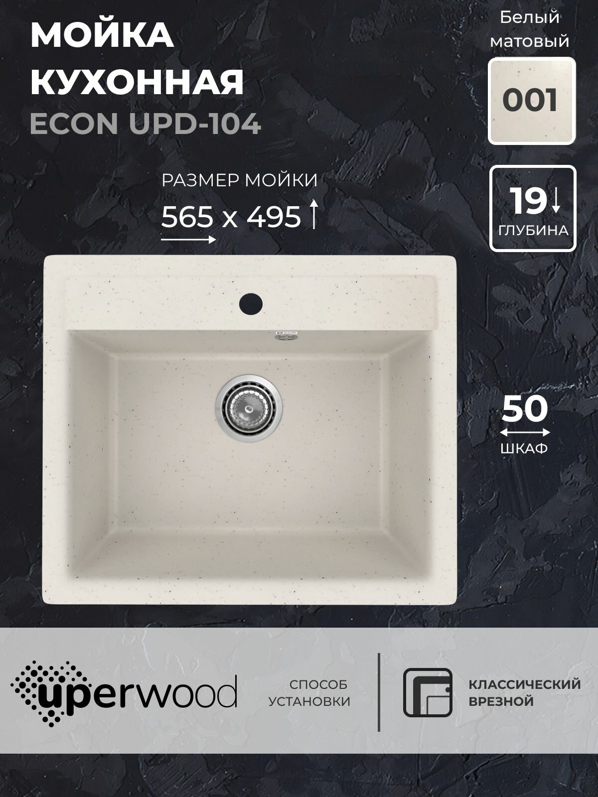 Кухонная мойка из искусственного камня Uperwood ECON UPD-104-001, прямоугольная, белая матовая информация: