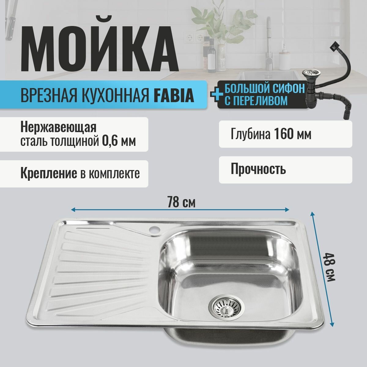 Мойка для кухни FABIA врезная, 78х48, глубина 160 мм, большой сифон с переливом, нержавеющая сталь 4 950 ₽