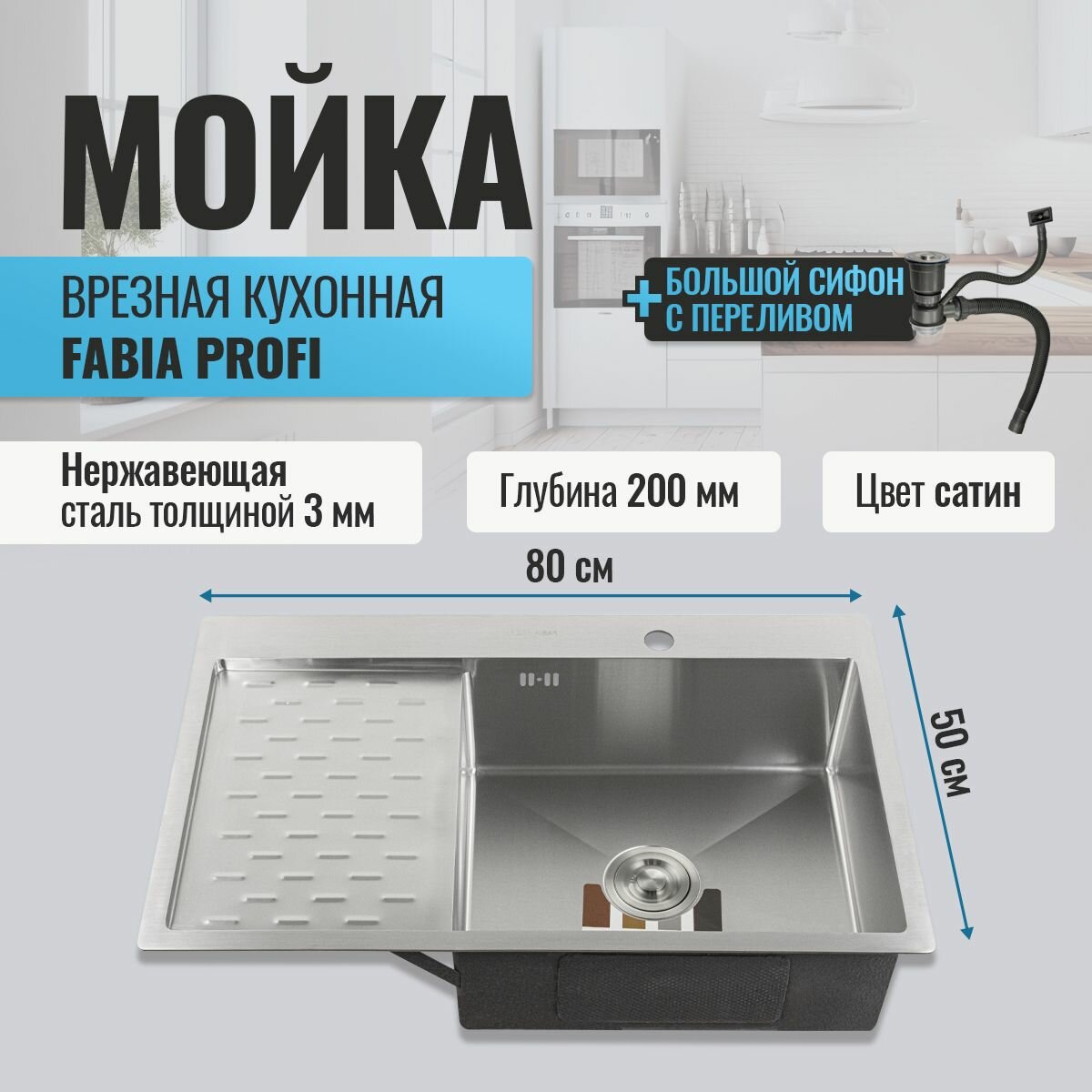 Мойка кухонная FABIA врезная, 80х50, глубина 200 мм, большой сифон, корзина в комплекте информация: