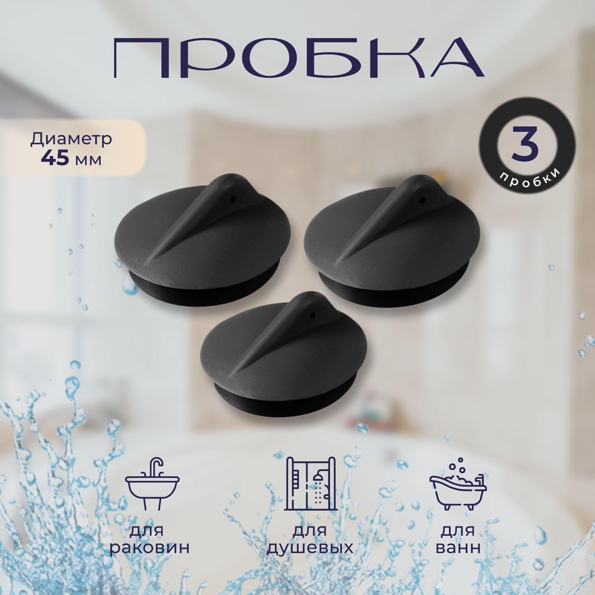 Пробка для ванн и раковин, диаметром 45 мм 3 штуки черная информация: