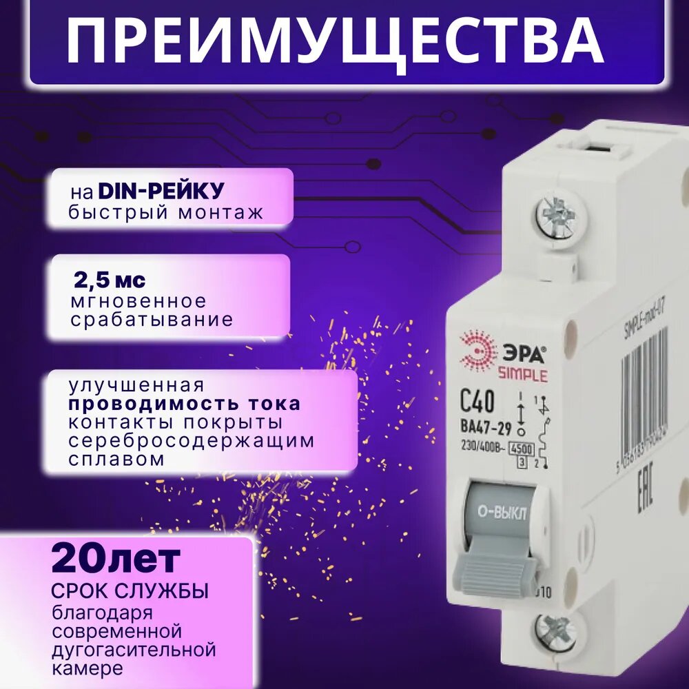 Автомат Б0039224 ЭРА SIMPLE-mod-07 1P 40А (C) выключатель ВА 47-29 3шт информация: