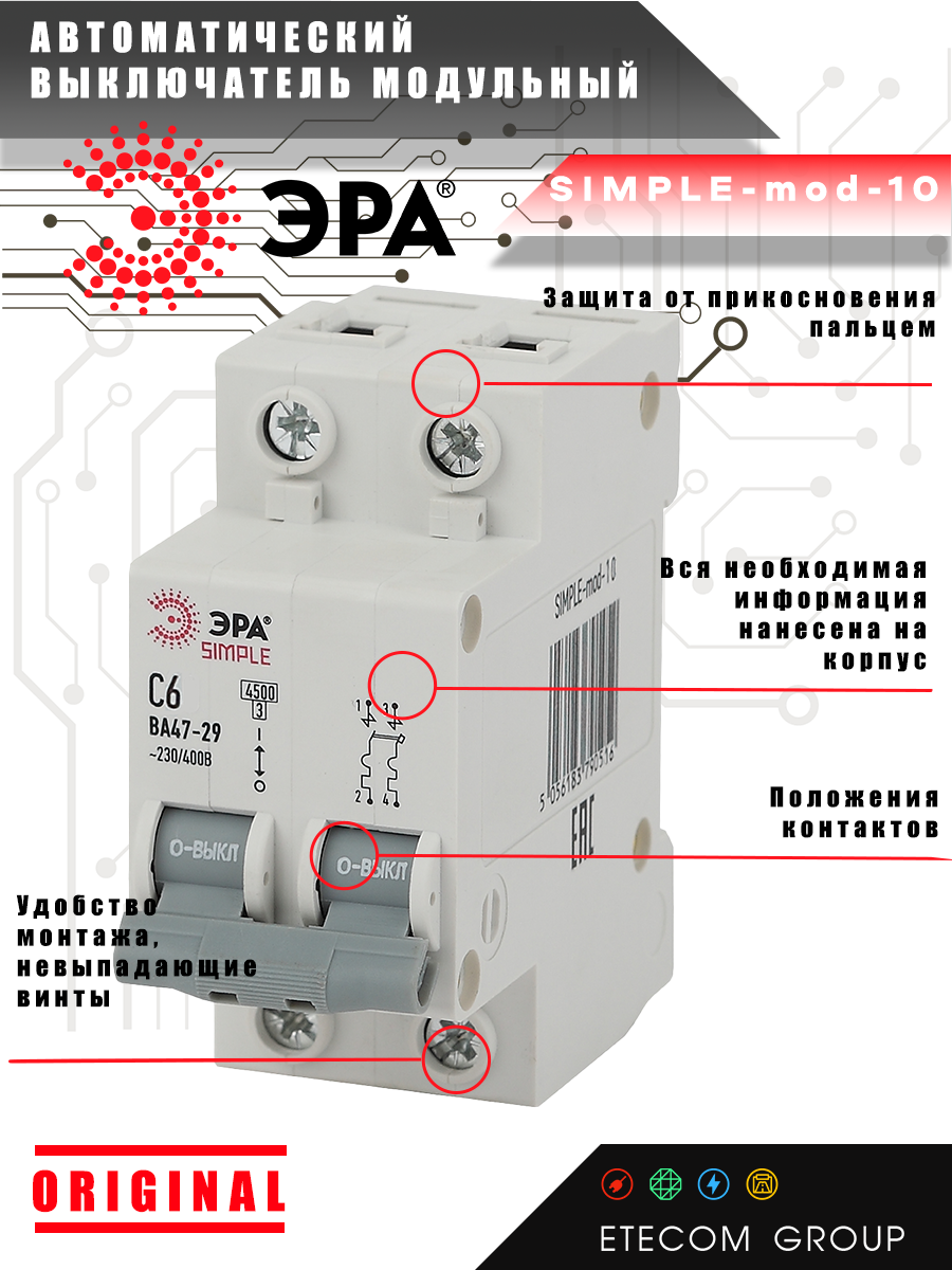 Выключатель автоматический модульный 1п C 6А 4.5кА ВА 47-29 SIMPLE-mod-01, ЭРА Б0039218 (1 шт.) 388 ₽