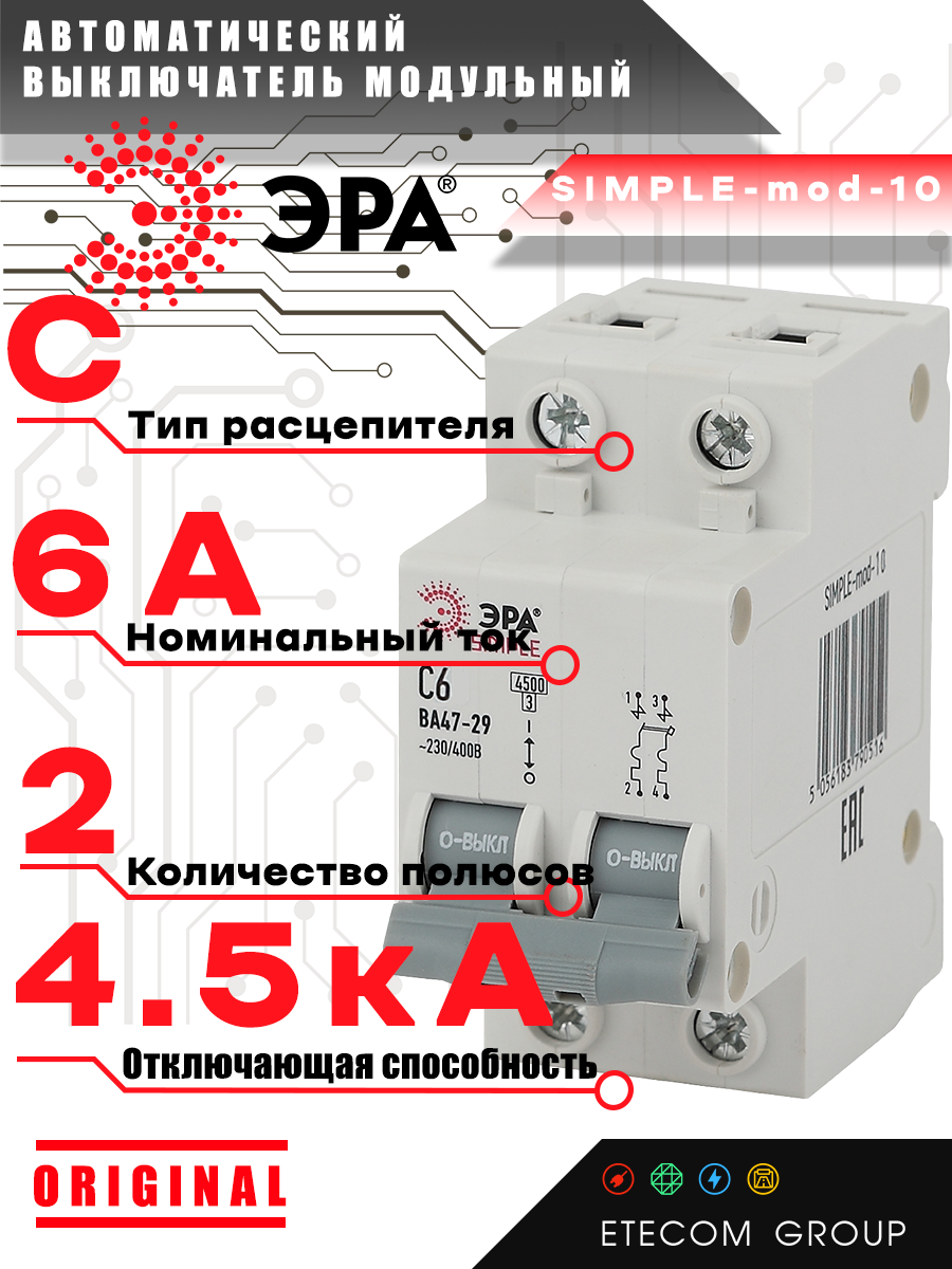 Отзывы на ЭРА SIMPLE Автоматический выключатель 2P 6А C 4,5кА ВА 47-29 Б0039227