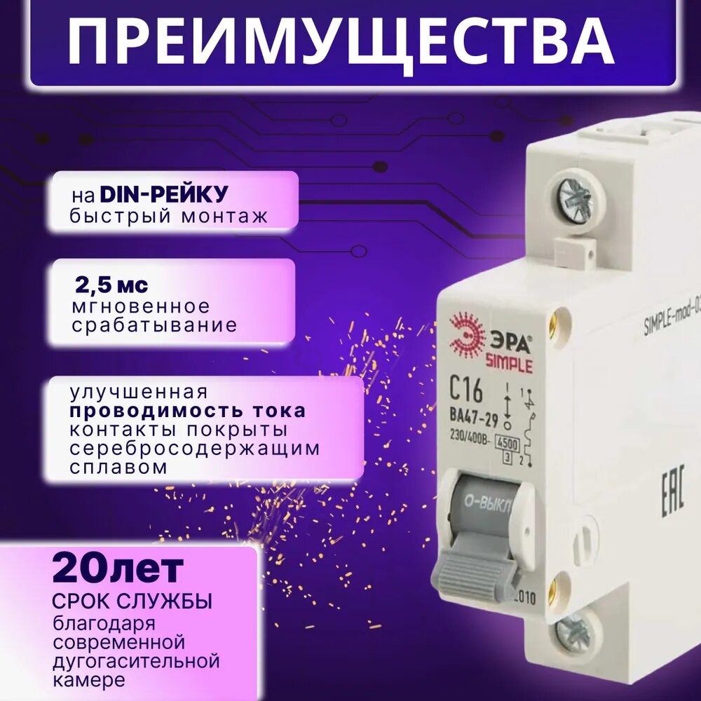 Выключатель автоматический модульный 1п C 16А 4.5кА ВА 47-29 SIMPLE-mod-03 ЭРА Б0039220